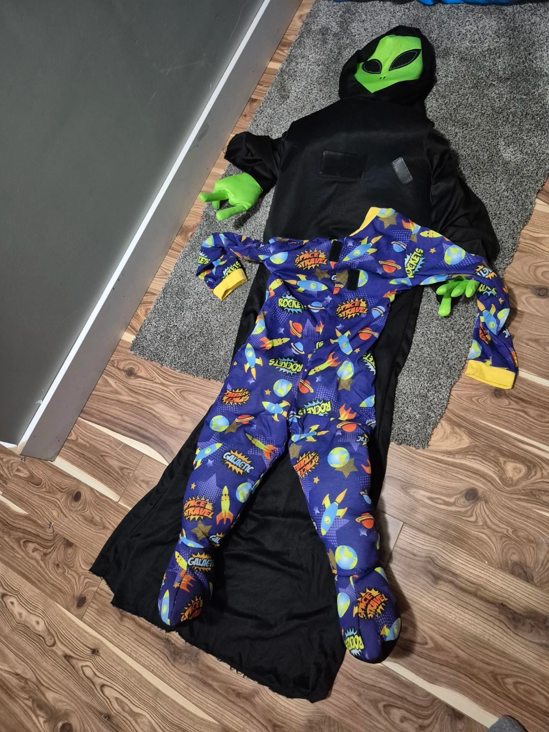 Blue footed pajamas for kids featuring a fun space rocket and planet print. Includes a black alien costume with a green hood and attached gloves. Great for bedtime or dress-up!