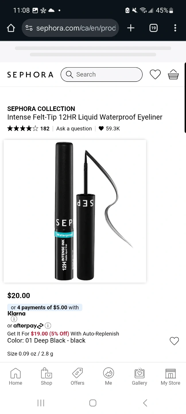 Sephora Collection Intense Felt-Tip Liquid Waterproof Eyeliner in 01 Deep Black. Waterproof formula lasts up to 12 hours.