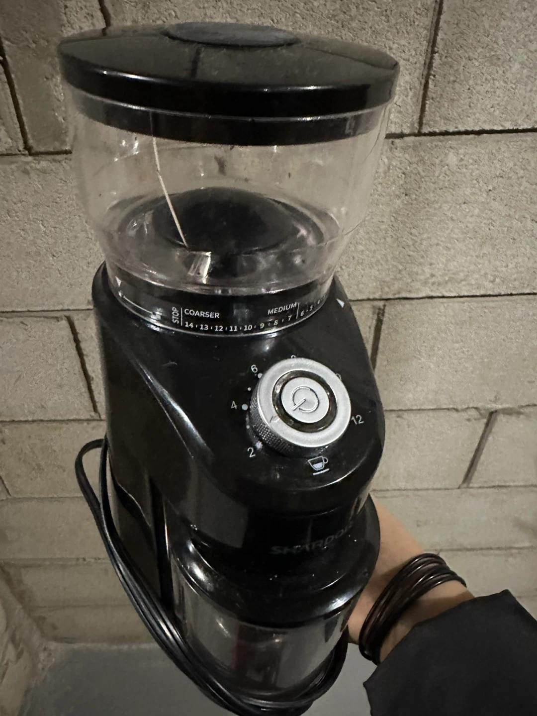 Electric coffee grinder with adjustable grind settings from coarse to fine. It has a removable container for ground coffee and a capacity for beans in the top hopper. Perfect for freshly ground coffee at home!