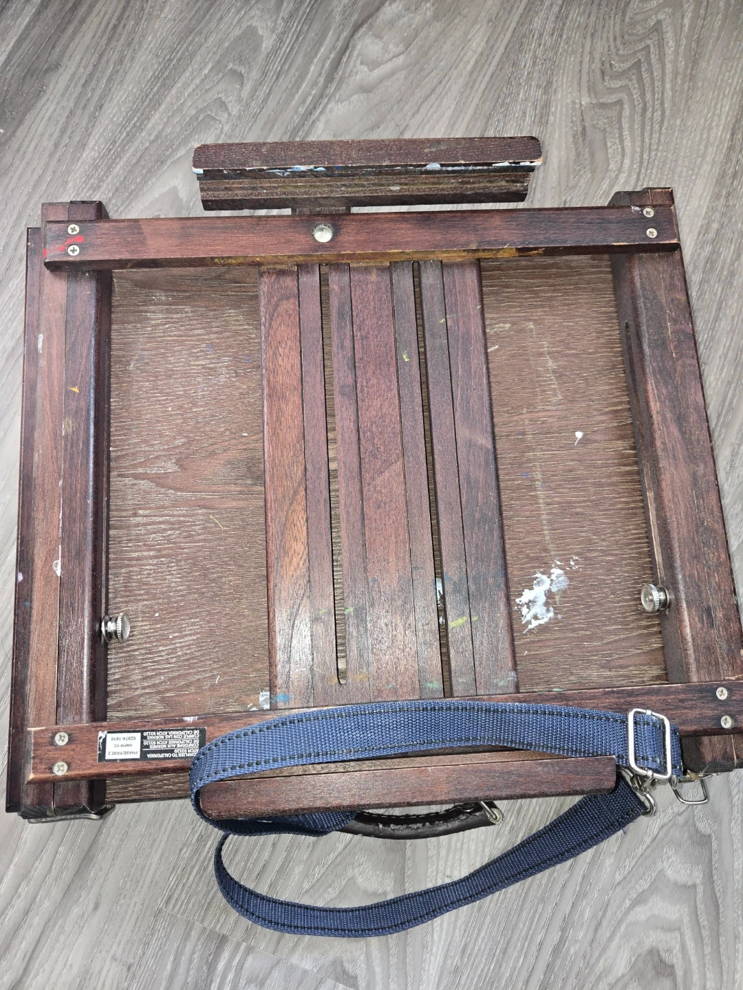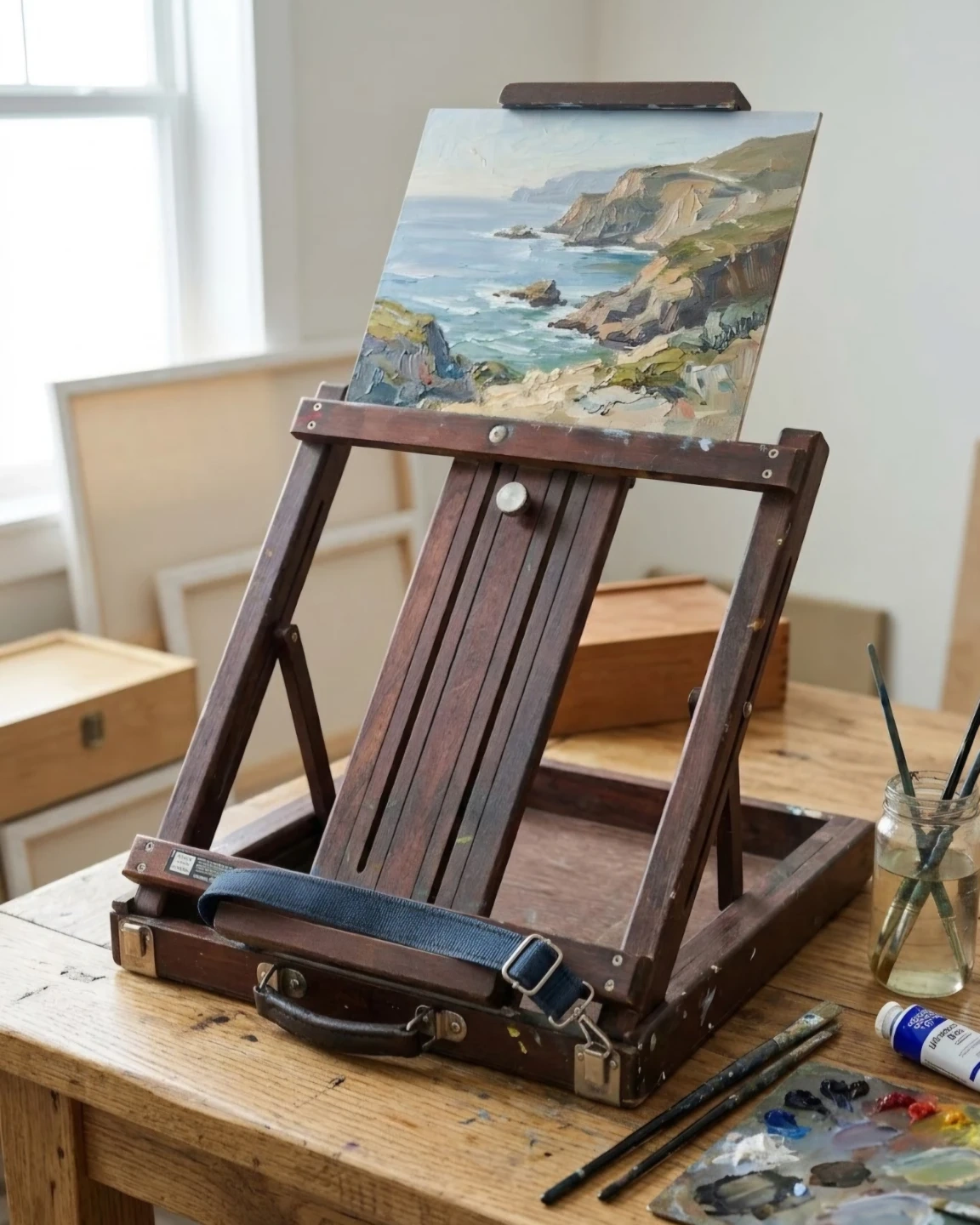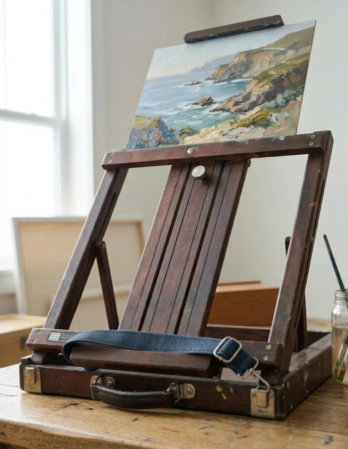 This is a vintage wooden portable art easel, perfect for artists on the go. It's made of solid wood and features a carrying strap for easy transport. It's great for plein air painting or studio use.