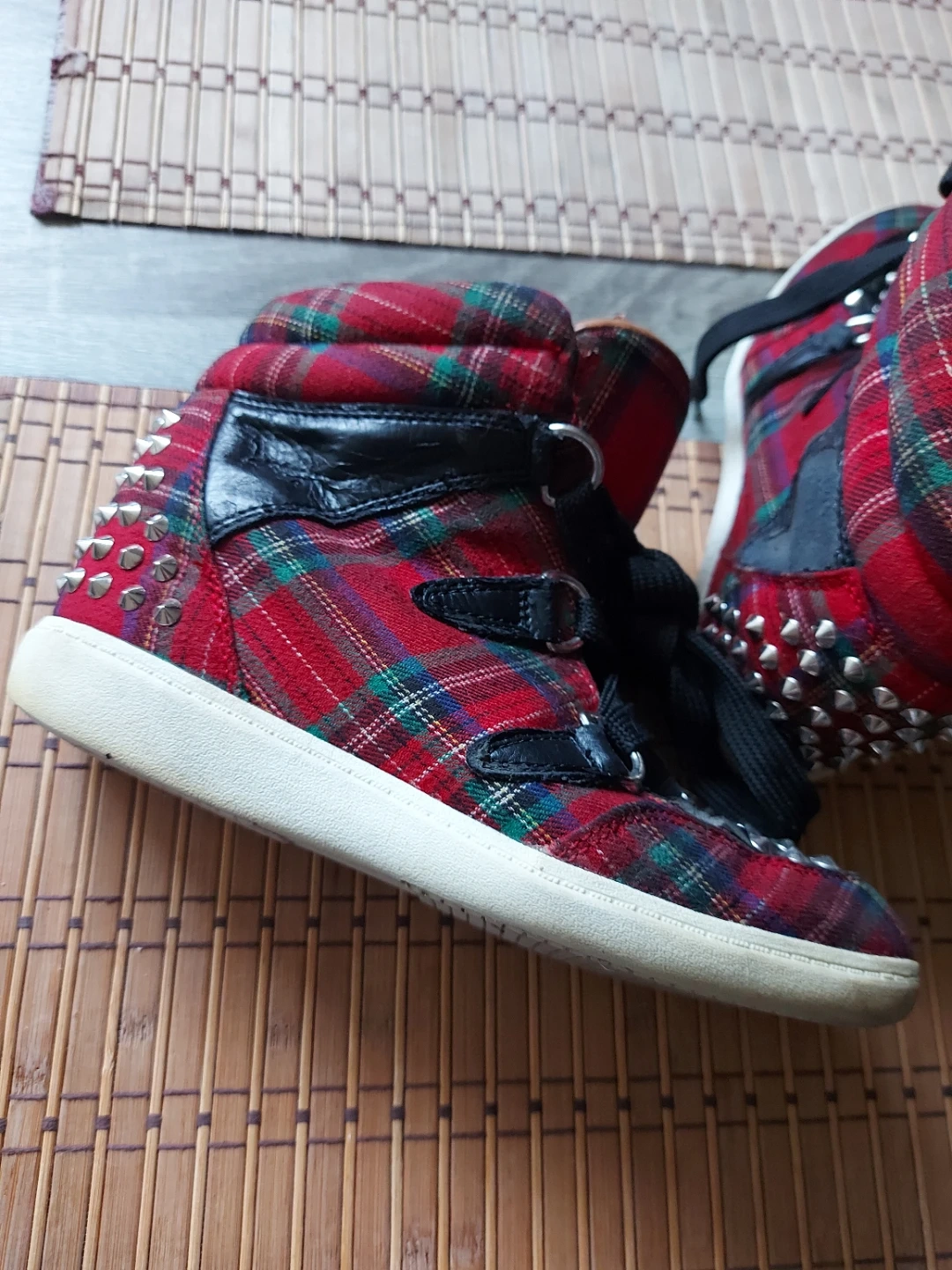 These red plaid high top sneakers are in great condition! They feature black leather accents and silver stud detailing. Perfect for adding a bit of edge to your outfit!