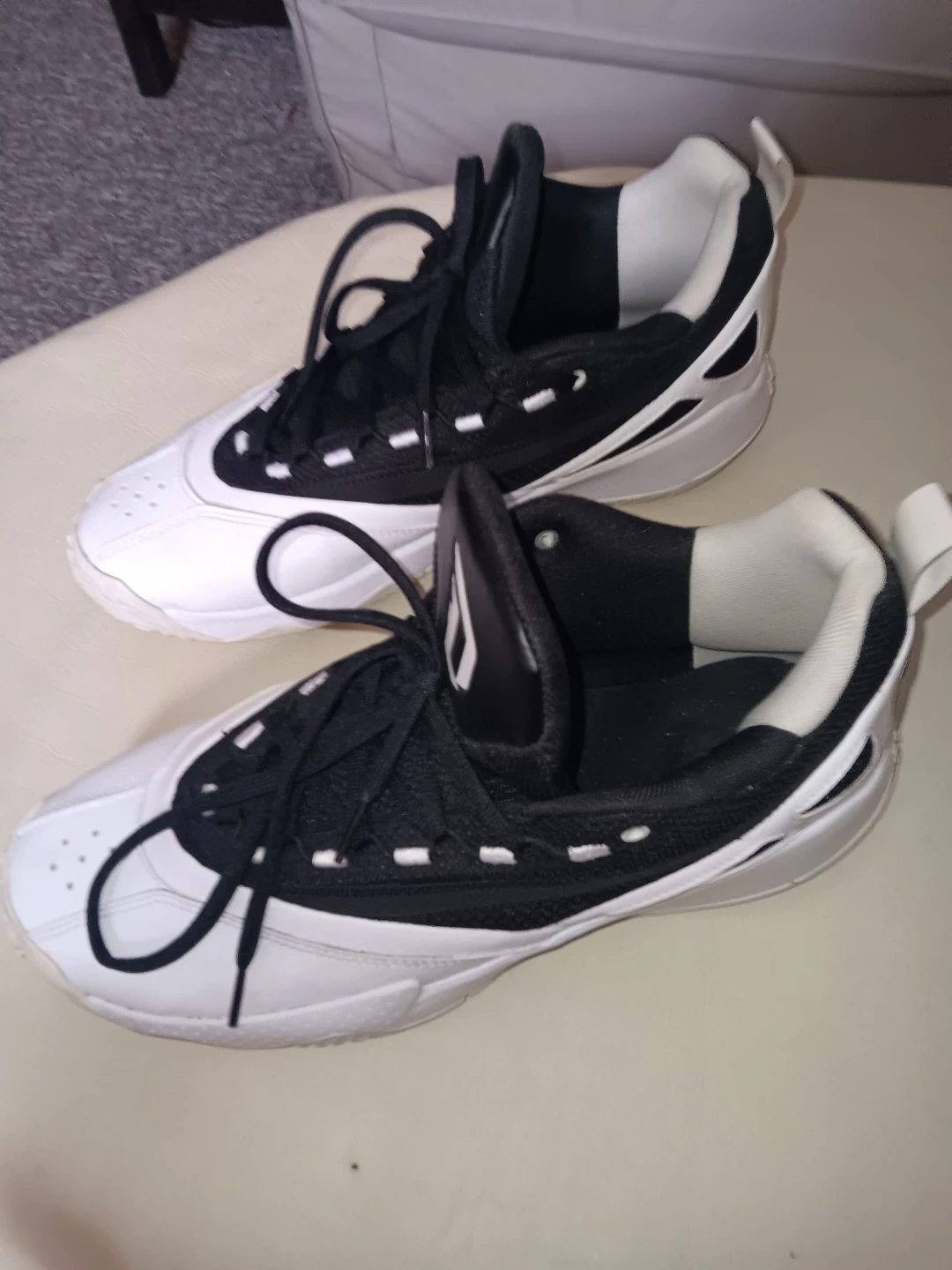 These Adidas Dame 8 basketball shoes are in a black, white, and grey colourway. They feature the "Dame Time" logo on the heel. Bounce cushioning provides comfort and support during play. Manufactured in 03/23.