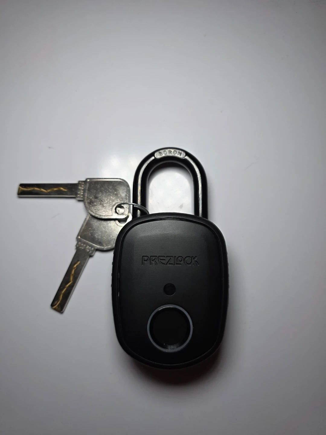 This is a PREZILOCK smart padlock that uses fingerprint recognition for unlocking. It's black and comes with two keys. The shackle is boron, and it has a USB-C port for charging.