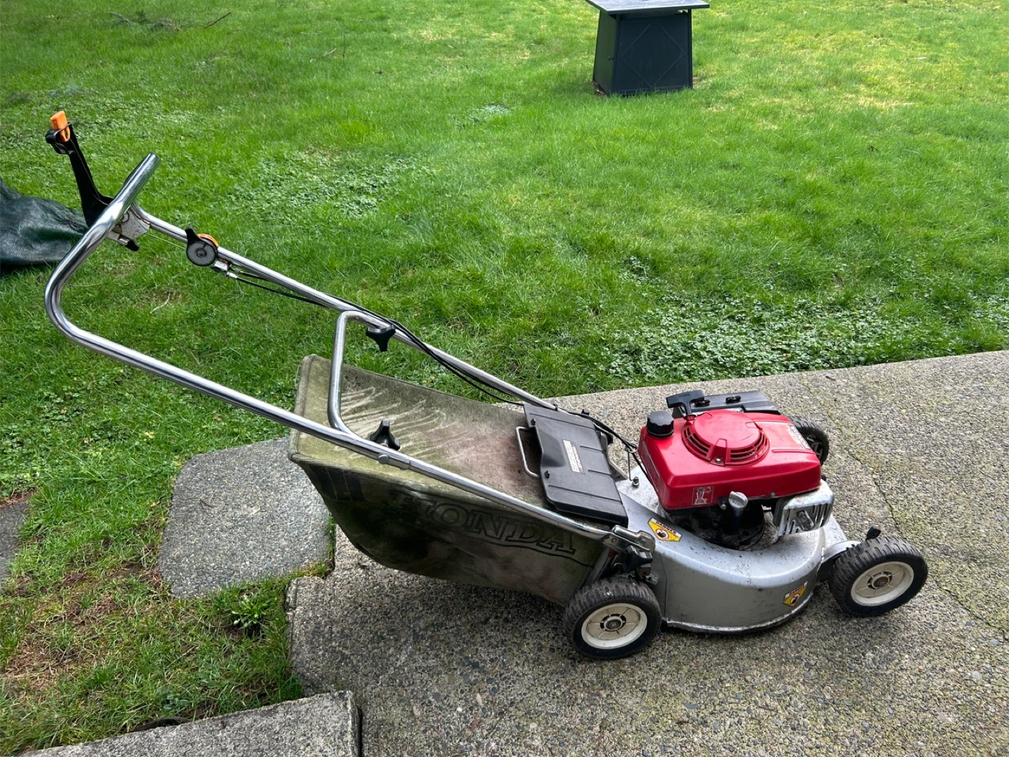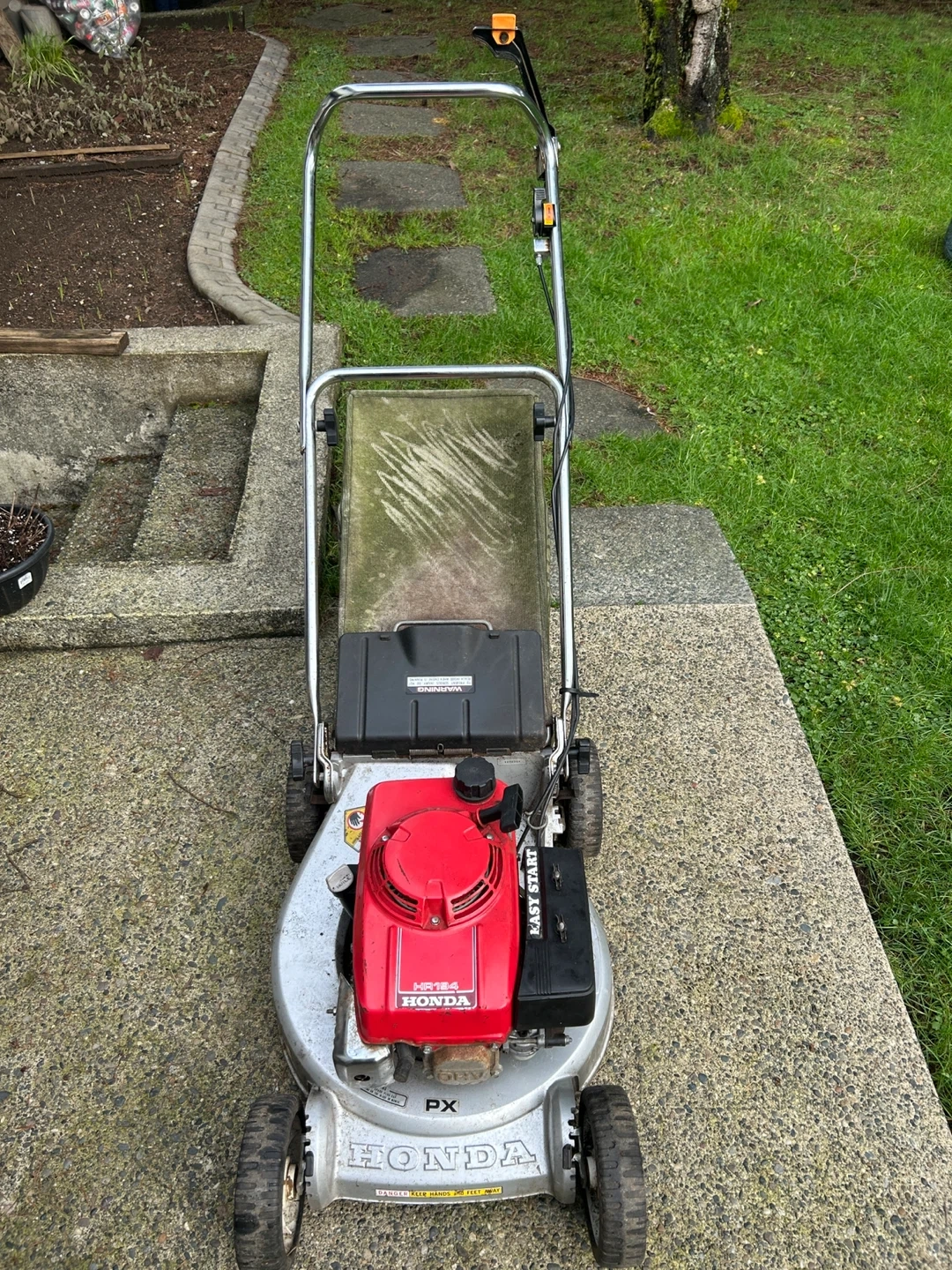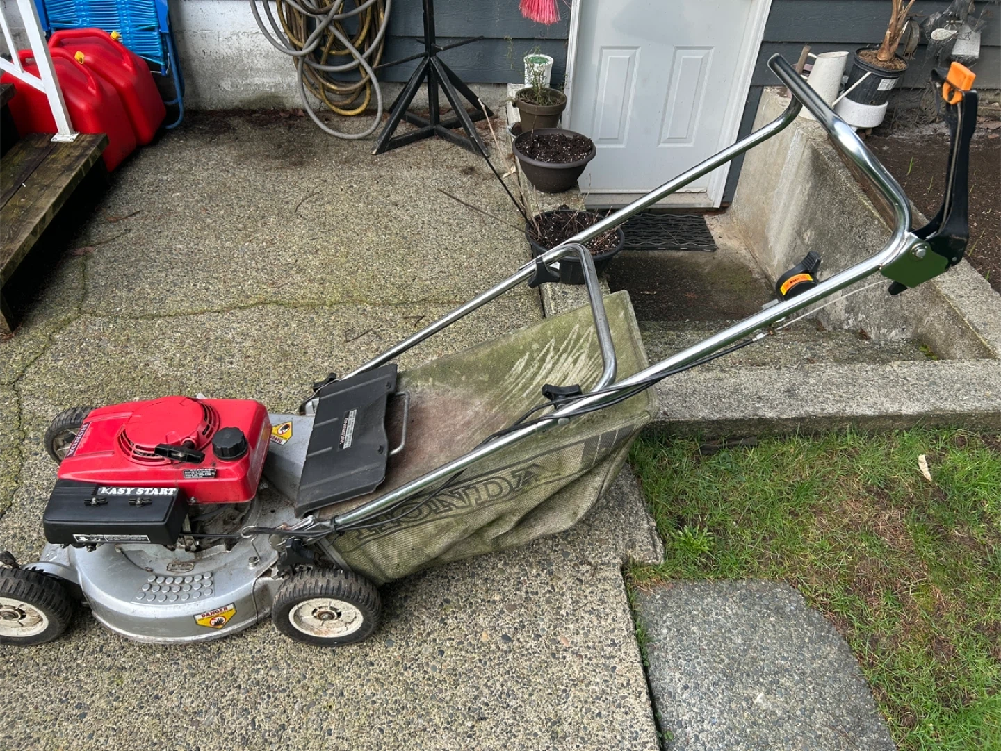 Honda lawn mower with a grass catcher bag. Easy start engine starts up in 2 pulls