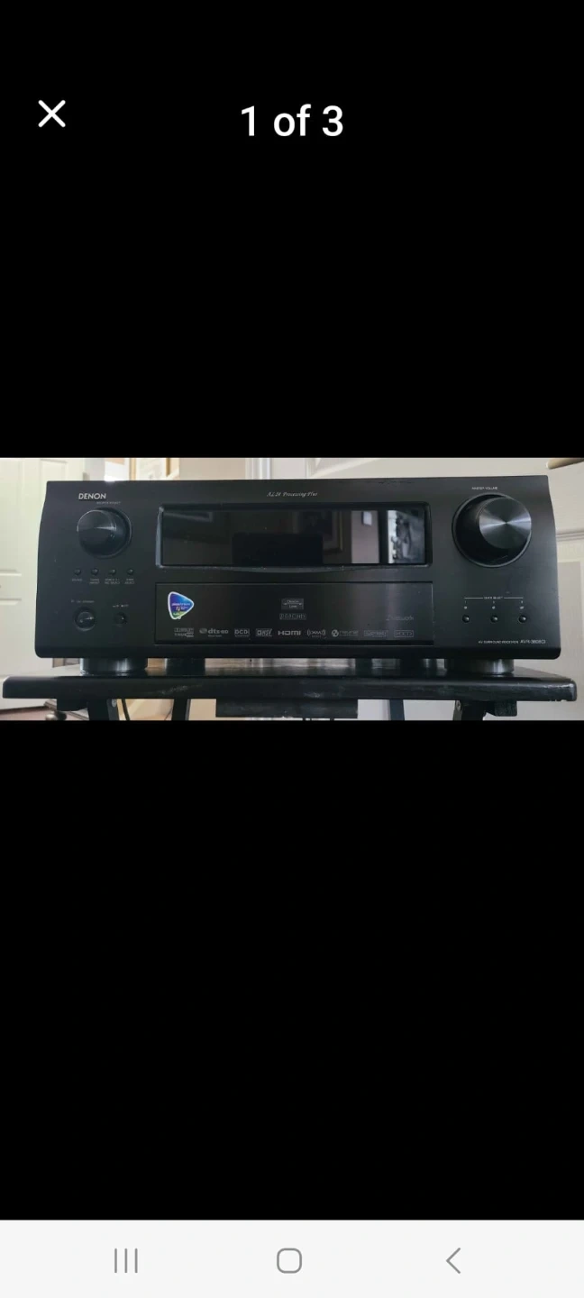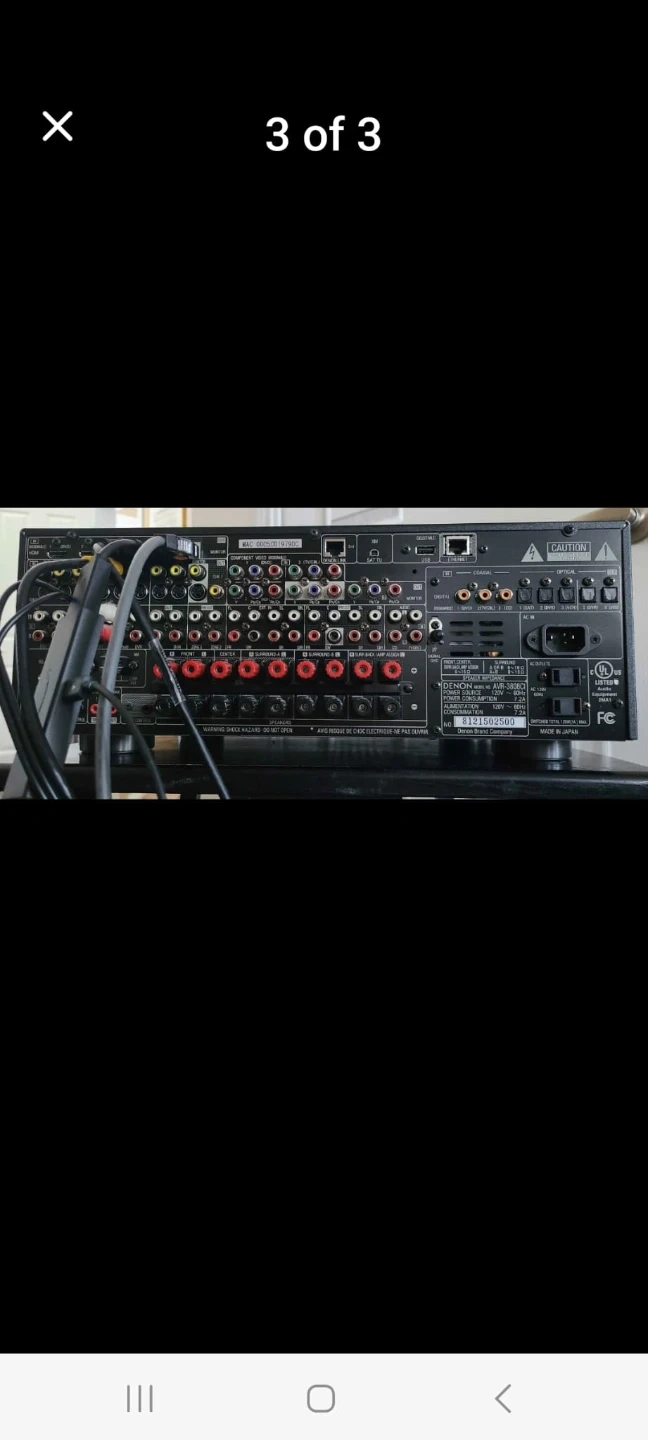 This is a Denon AVR-3808CI AV Receiver. It has multiple input and output connections on the back for audio and video components. It's a black, component receiver. No remote