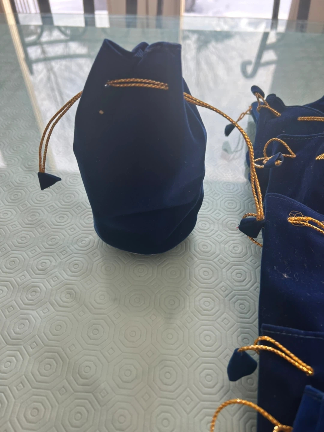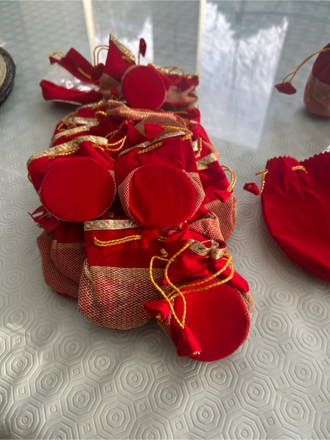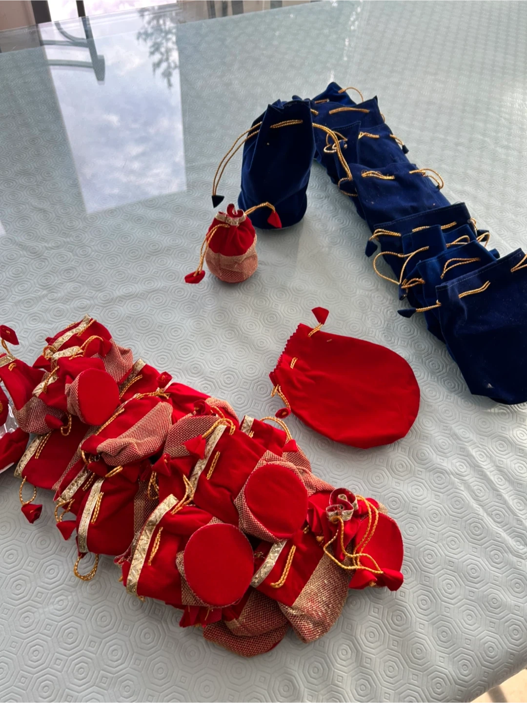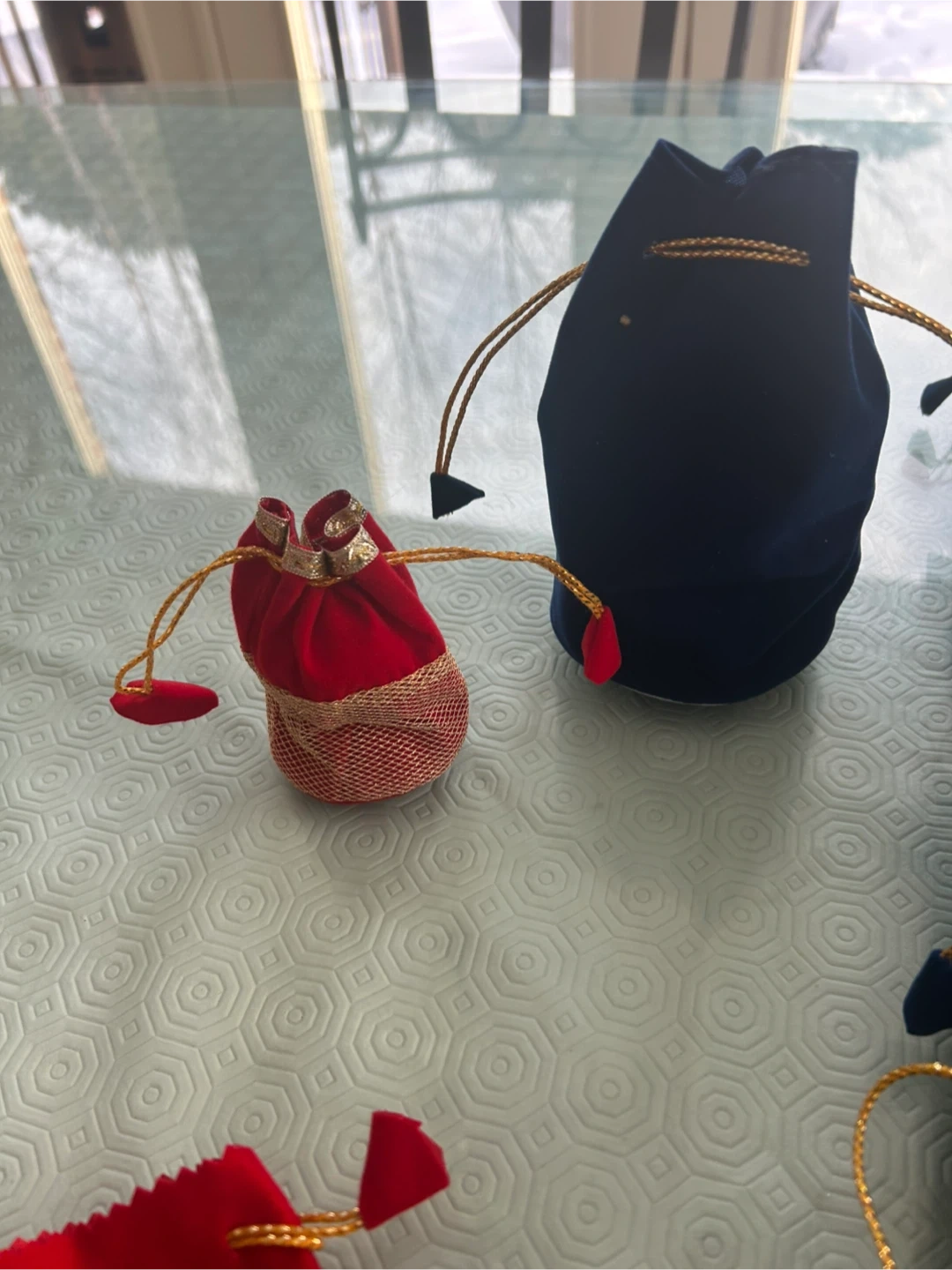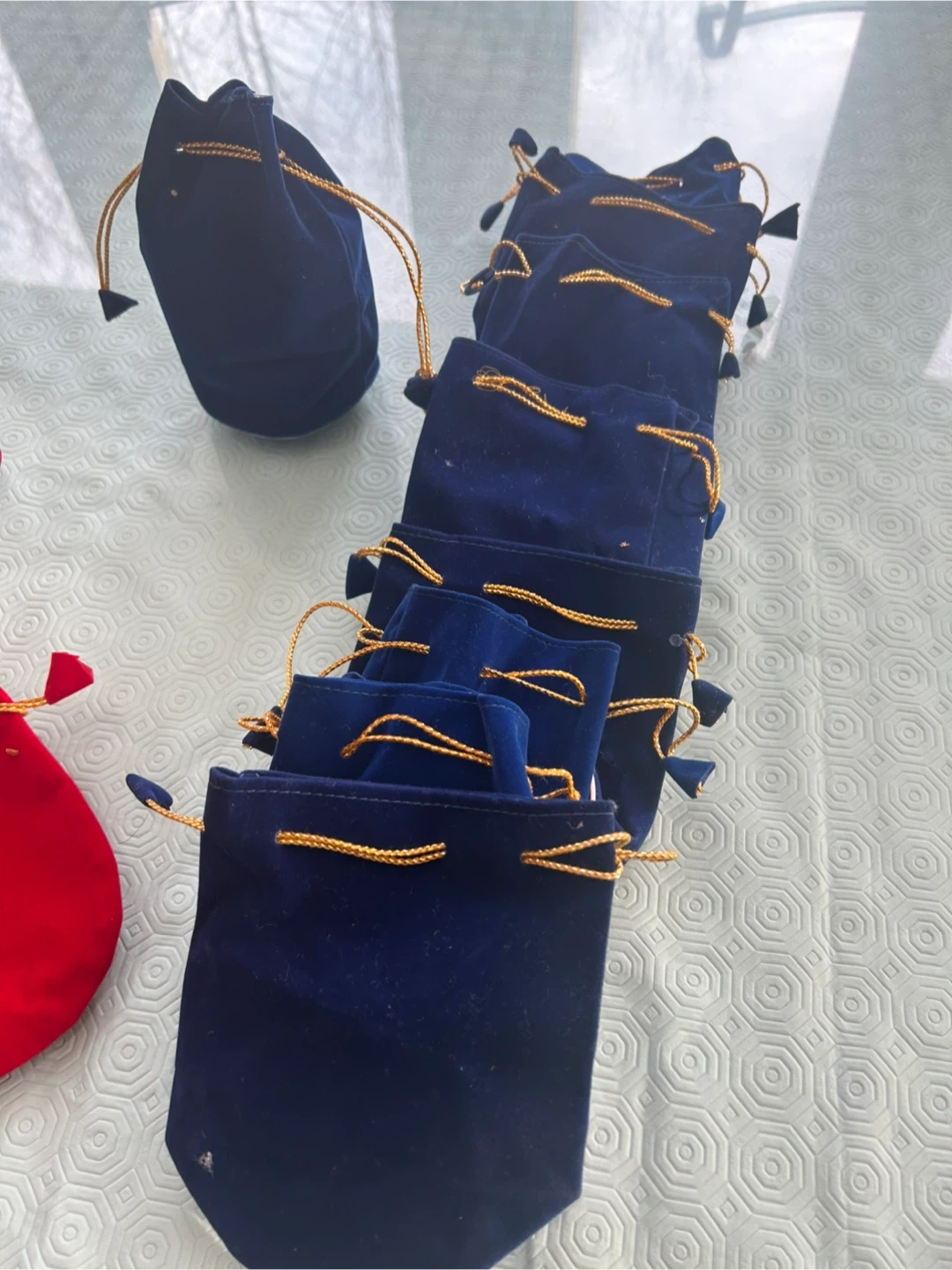 I have a collection of small velvet drawstring gift bags available! They come in both red and blue. Perfect for holding small items or gifts
