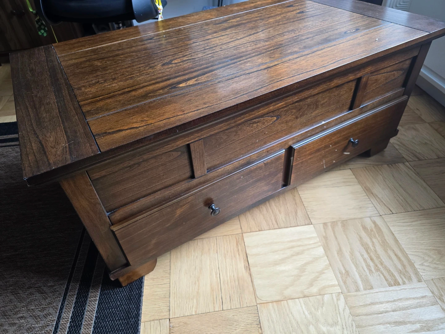 This dark wood coffee table features a lift-top design for hidden storage. It also has two drawers on the front for additional organization. Plenty of space for remotes, books, or decor!