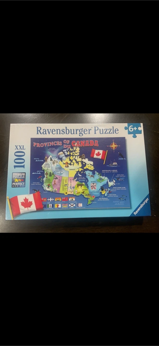 Ravensburger puzzle featuring a map of the Provinces of Canada. It's an XXL 100-piece set. Made in Germany.