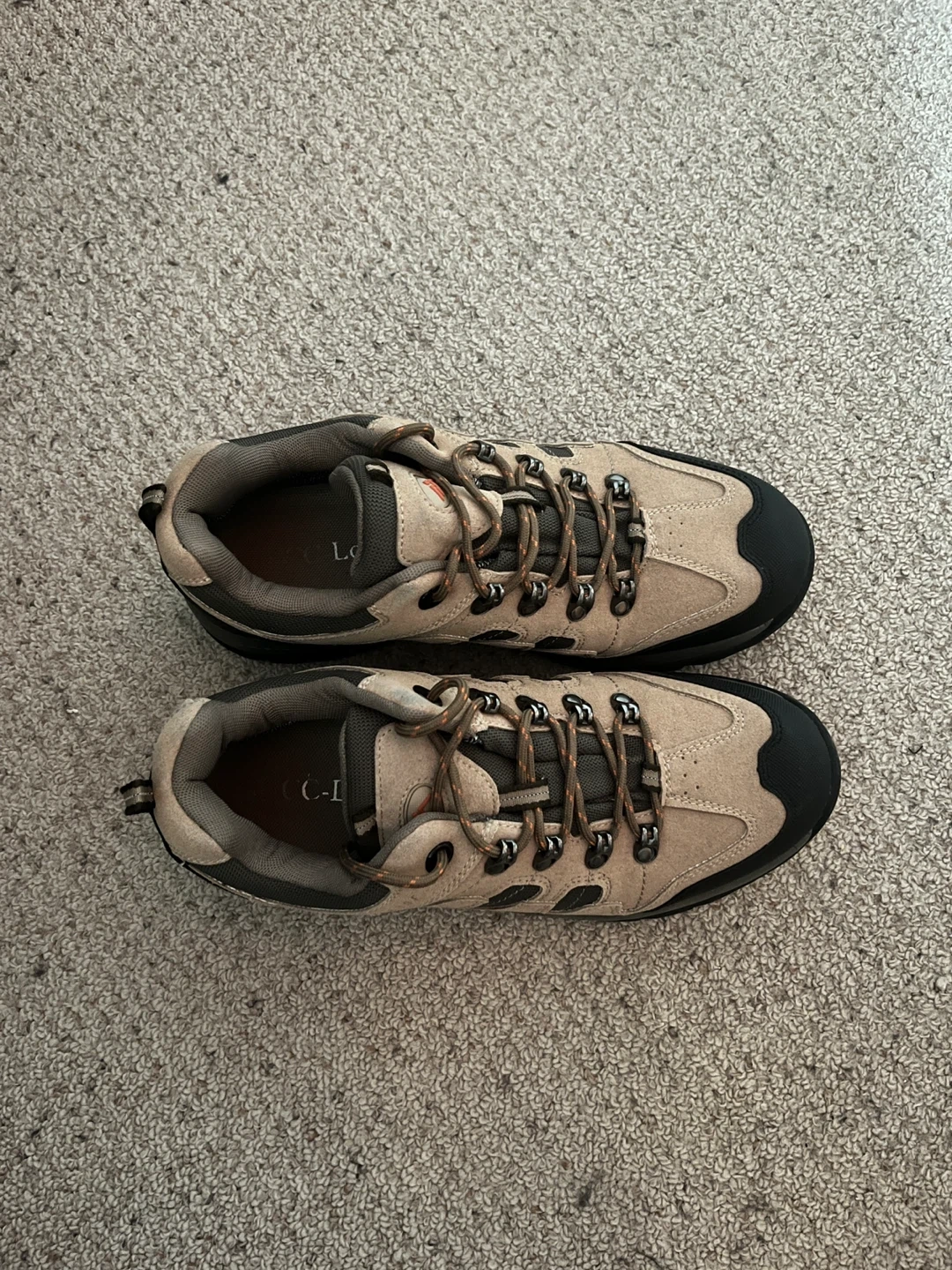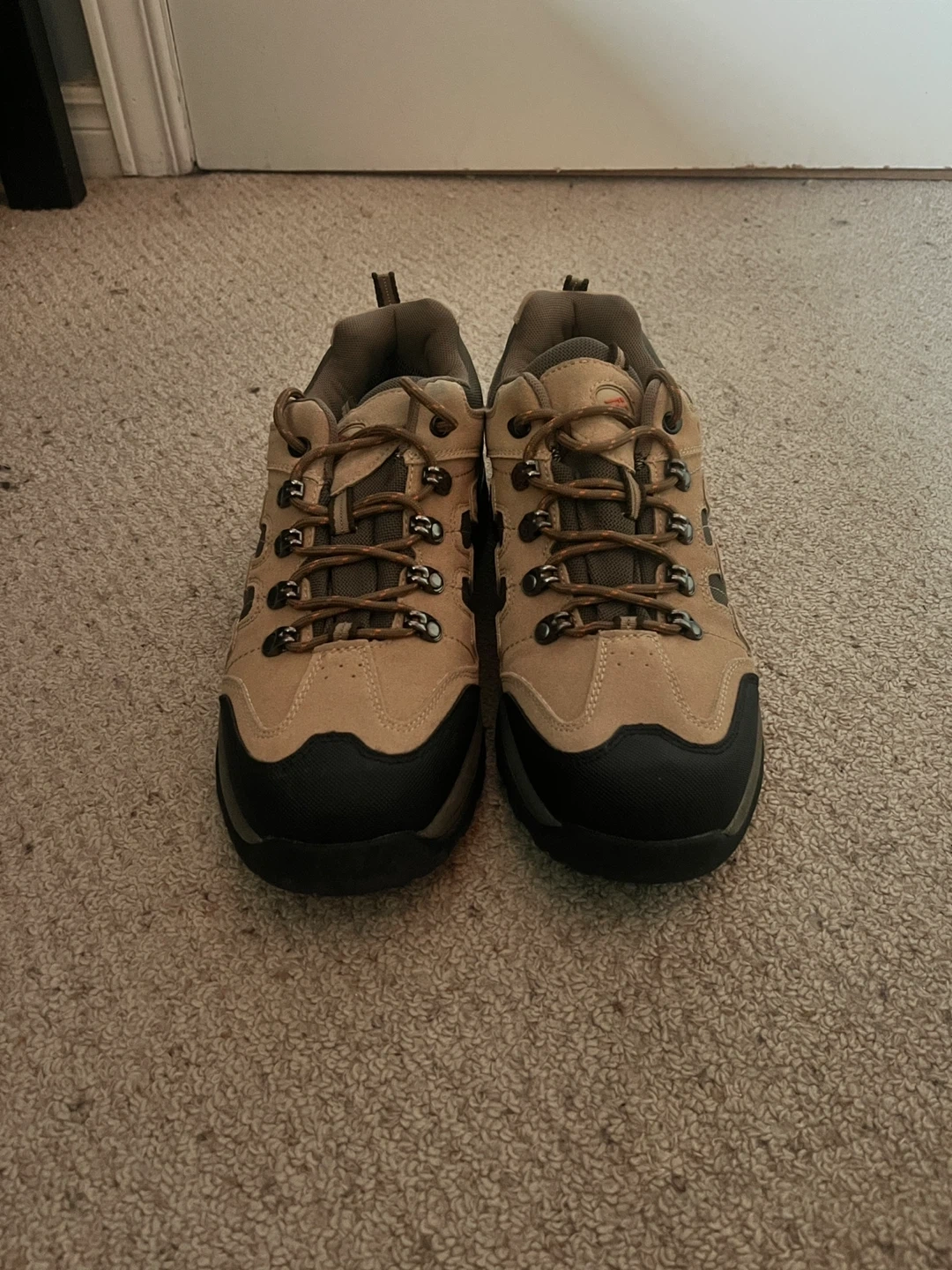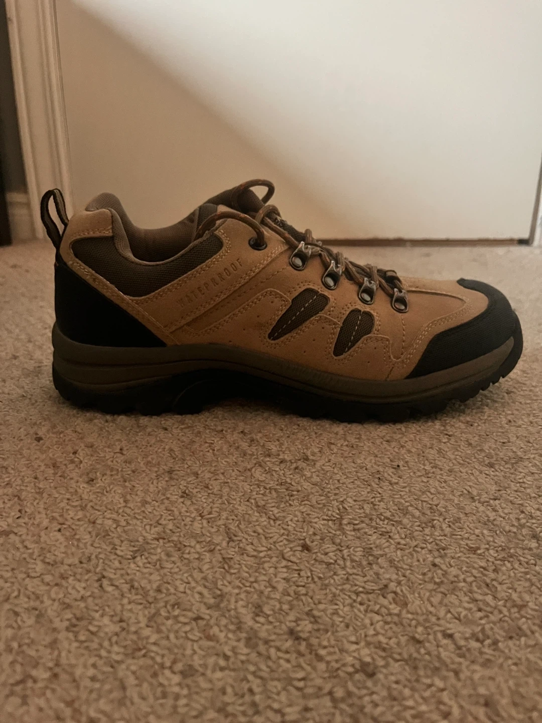 Tan and black waterproof hiking shoes. Lace-up closure with durable sole. Suitable for trails and outdoor activities. Only used once; in great condition.
