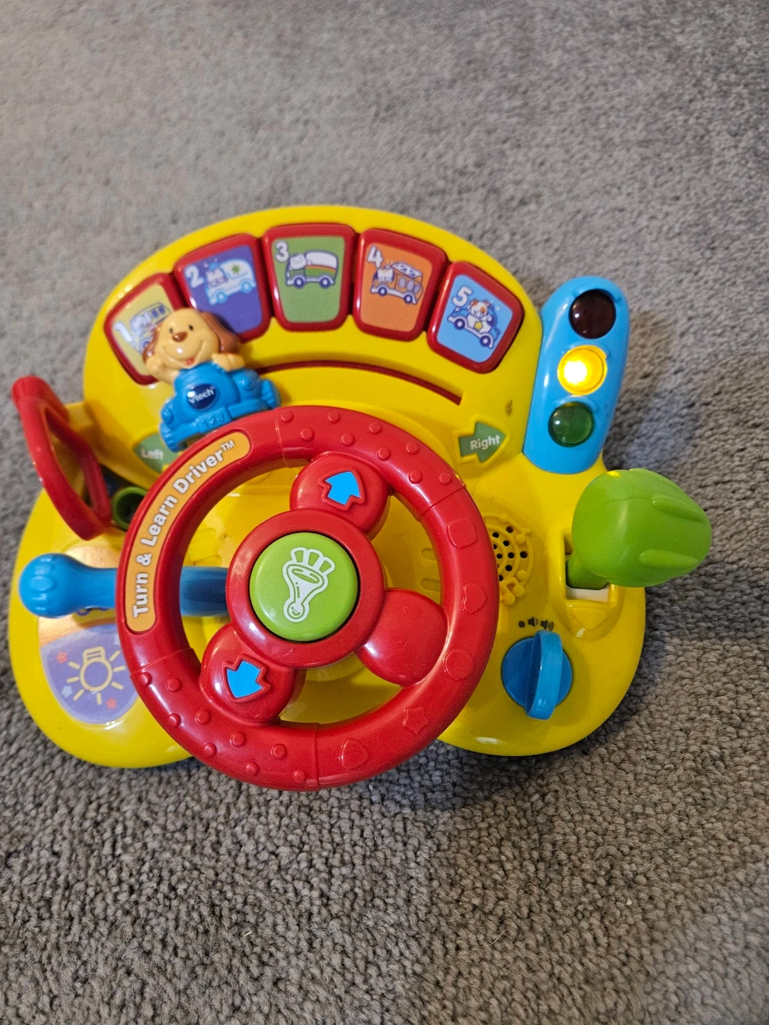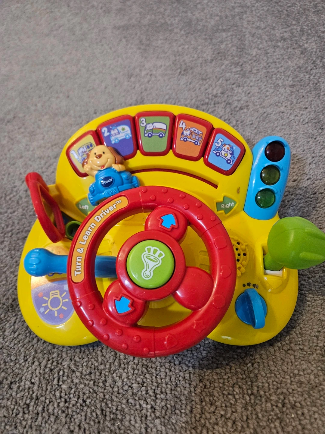 This VTech Turn & Learn Driver steering wheel toy is yellow with red accents. It features buttons and sounds to engage young children. It's designed to mimic a car's dashboard and steering wheel for interactive play.