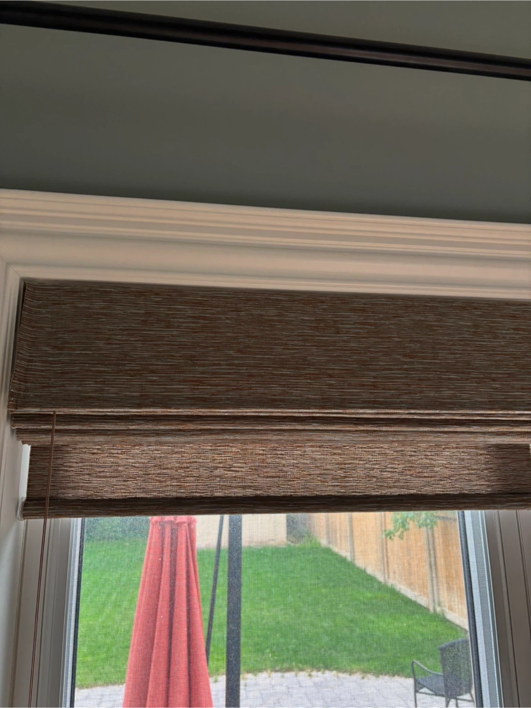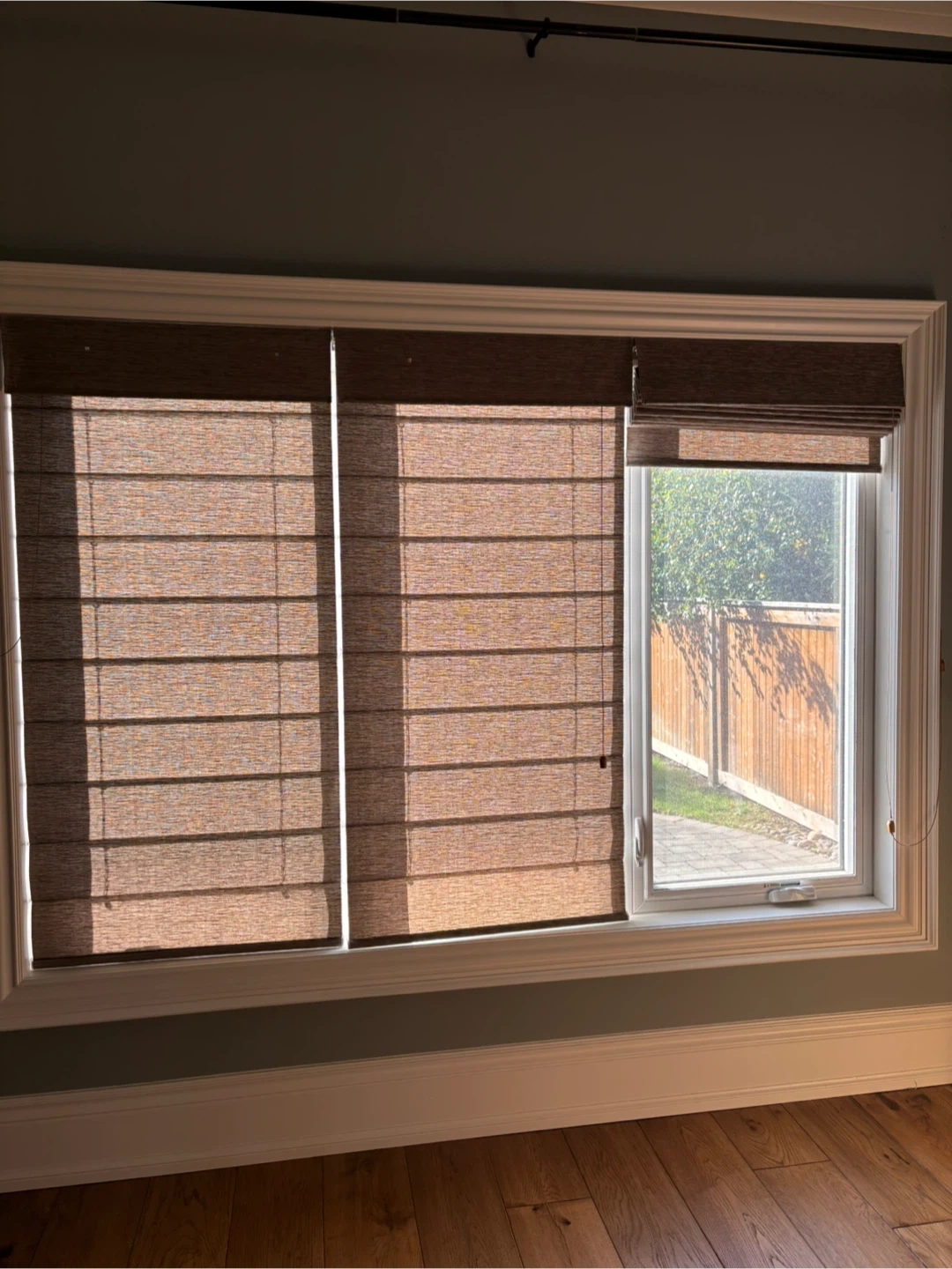 These are brown Roman blinds. They're made of textured fabric. The blinds offer privacy and light control.