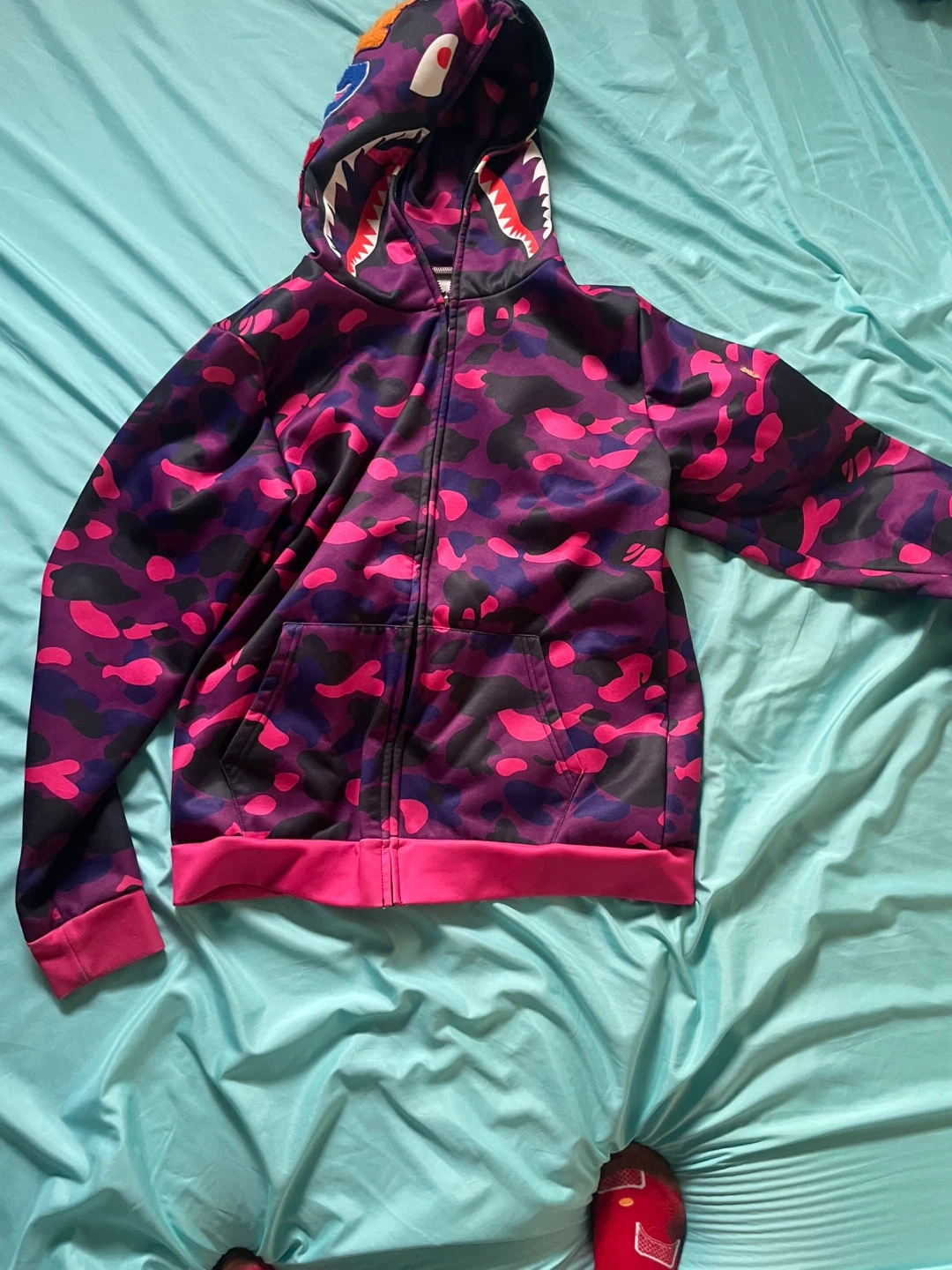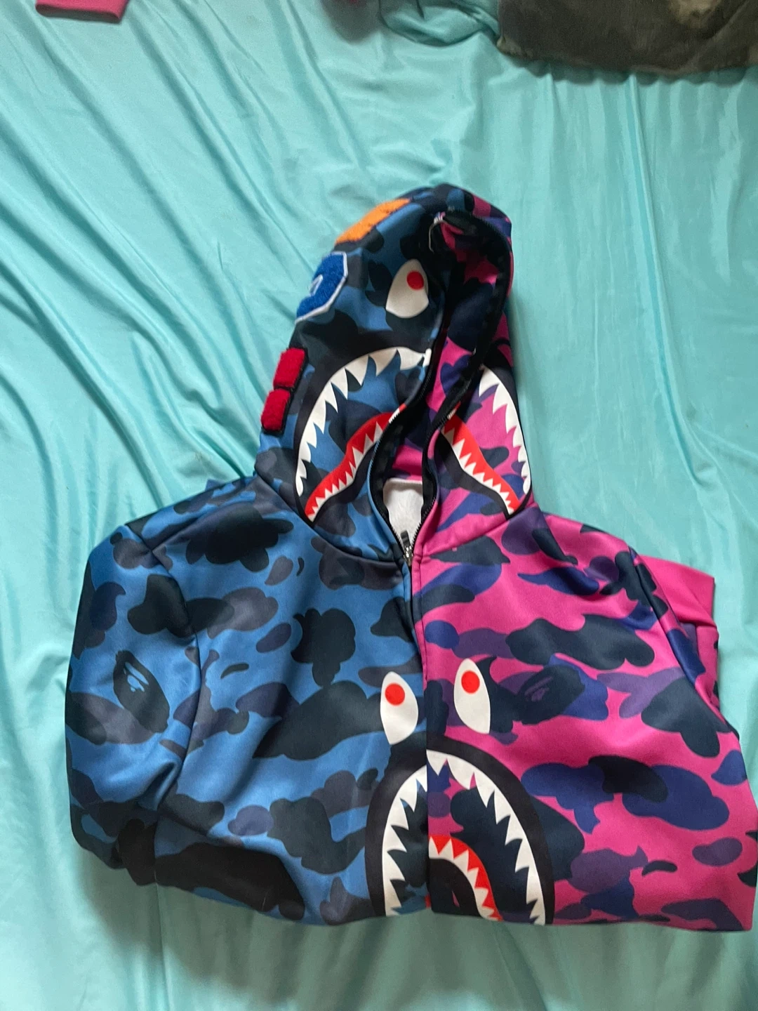 Iconic BAPE hoodie featuring the signature shark graphic. It's a cool piece with a unique camouflage pattern. This hoodie is eye-catching and stylish!