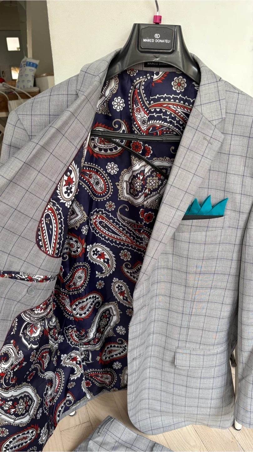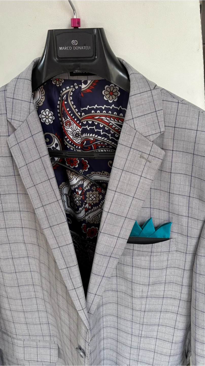 Selling a Marco Donatelli suit. It's a stylish grey plaid colour, and includes the jacket and pants. The lining has a cool paisley pattern and there's a teal pocket square detail
