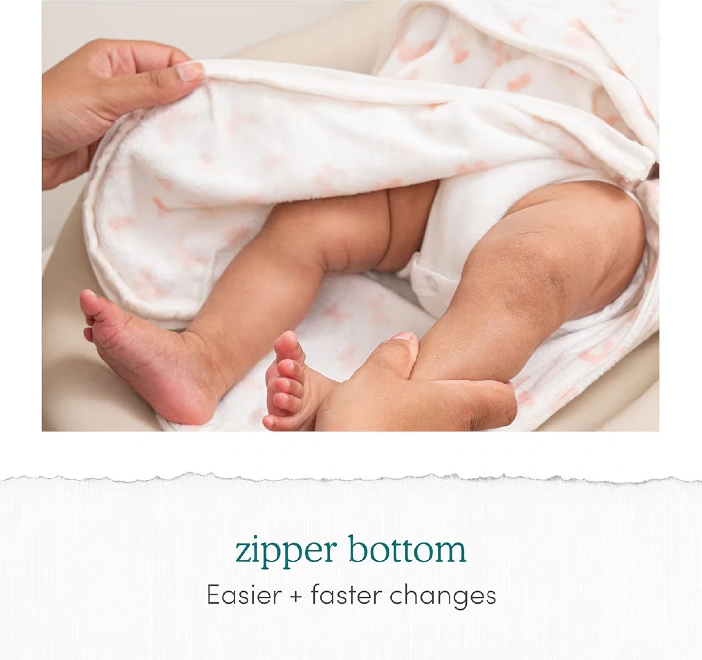 Set of three baby swaddle blankets featuring a solid pink, a pink floral print, and a white woodland animal print. Zipper bottom for easier and faster changes. Made with soft fabric for baby's comfort.