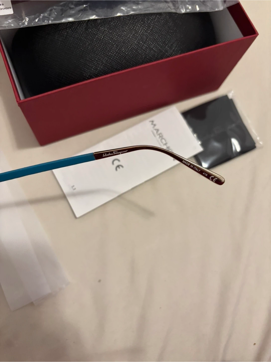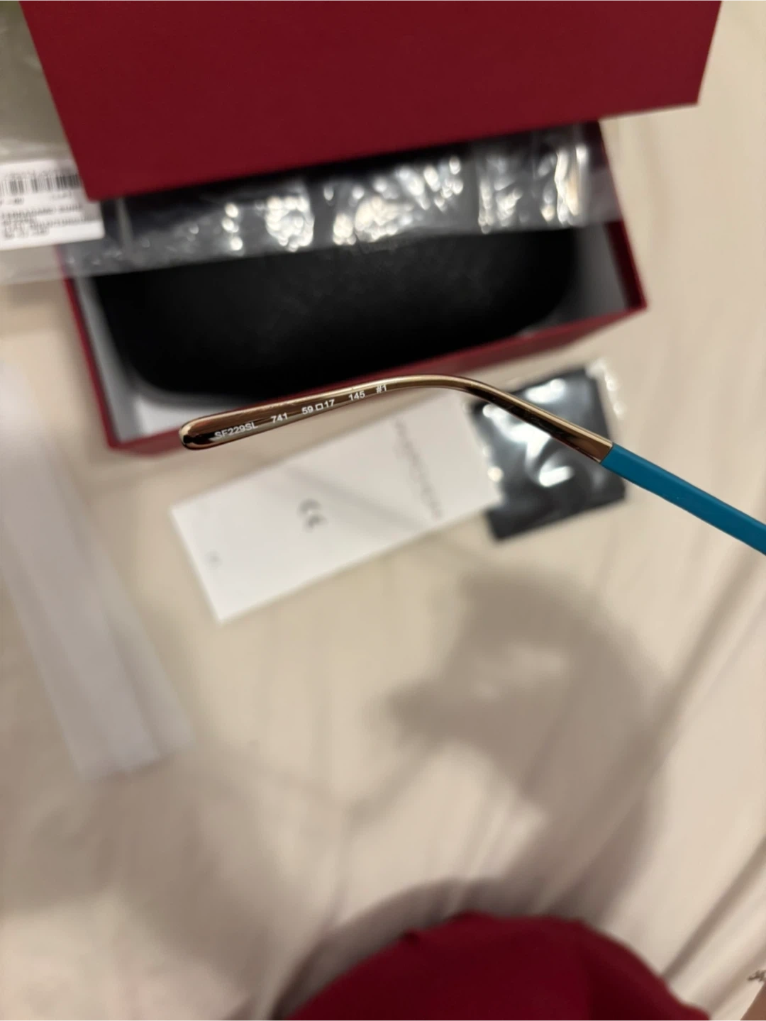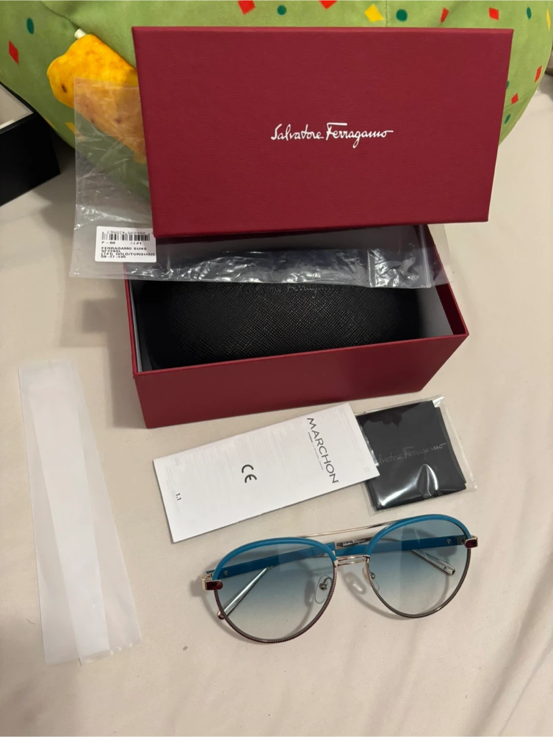 These Salvatore Ferragamo SF225SL sunglasses are in new condition and come with the original box. The stylish turquoise colour makes them a great accessory for any outfit. The model number is SF225SL 741 59017 145 #1.