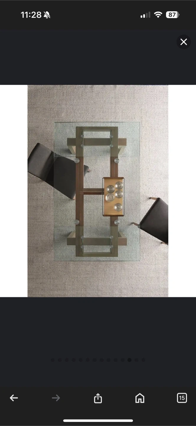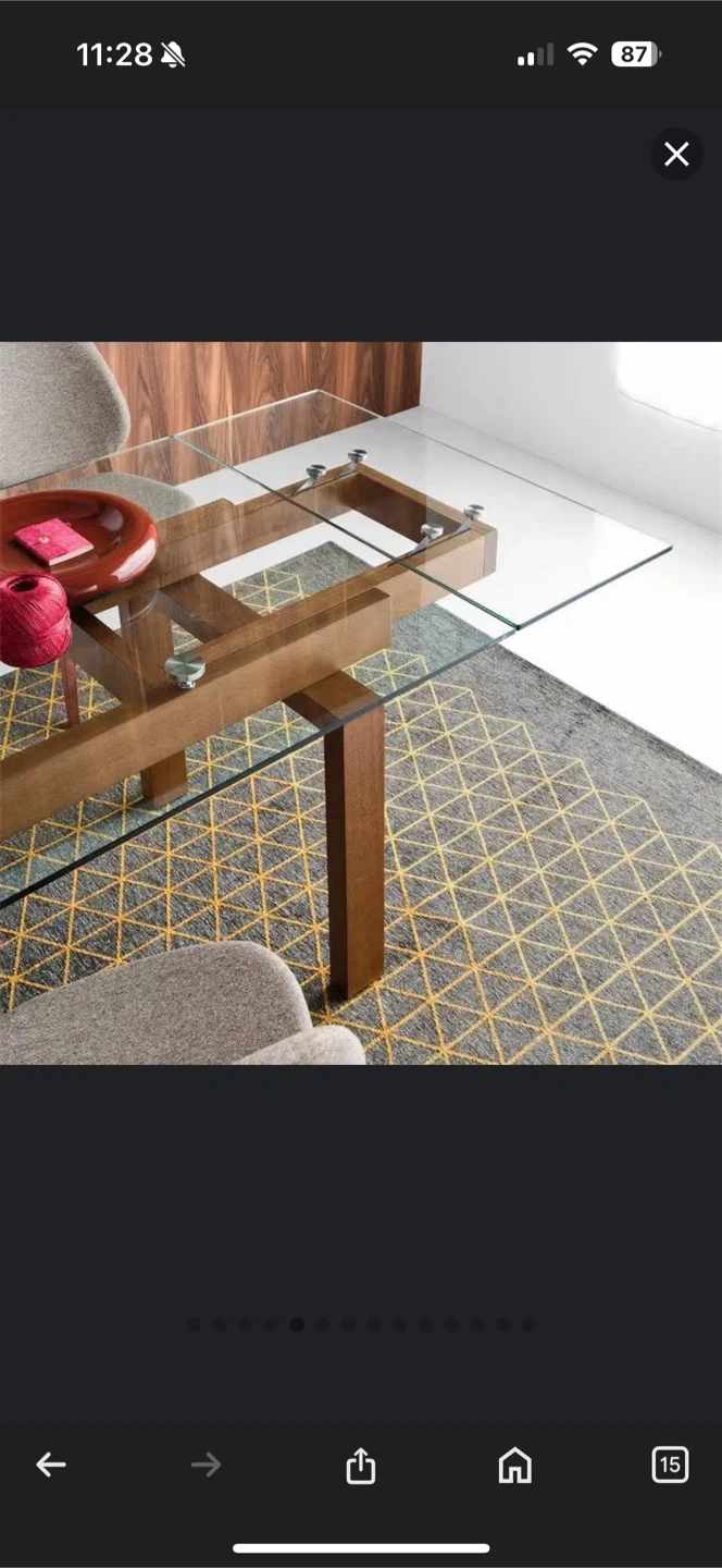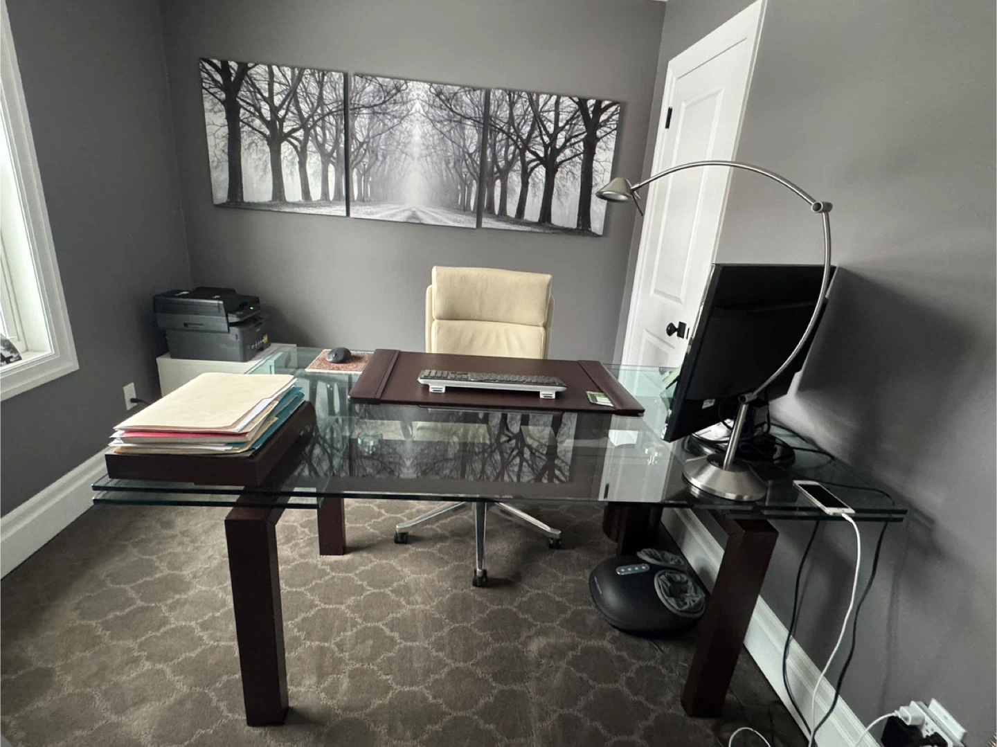 Modern office desk featuring a tempered glass top and sturdy dark wood legs. It's a spacious desk with a clean design, perfect for a home office setup. Plenty of surface area for your computer and work essentials.