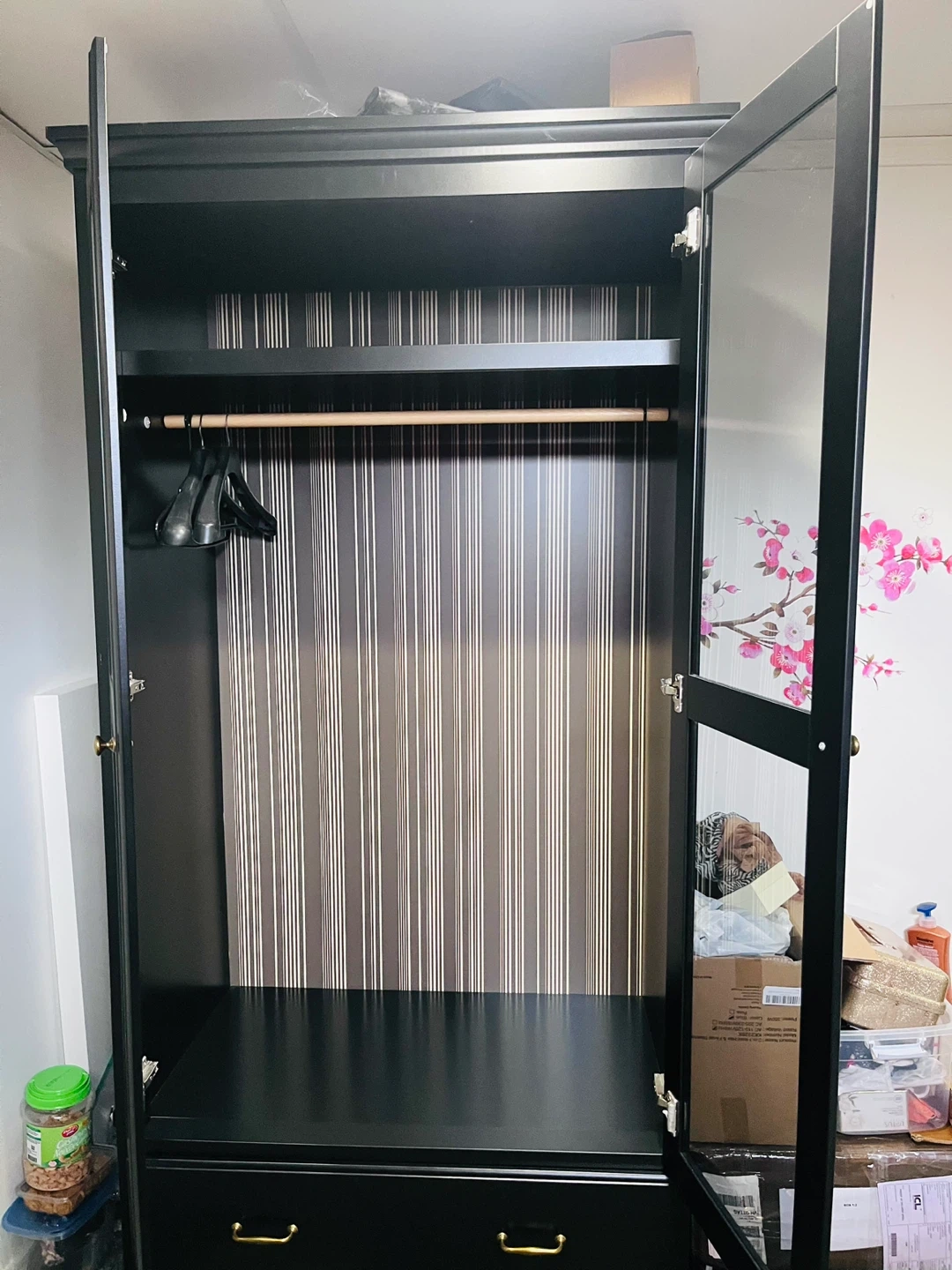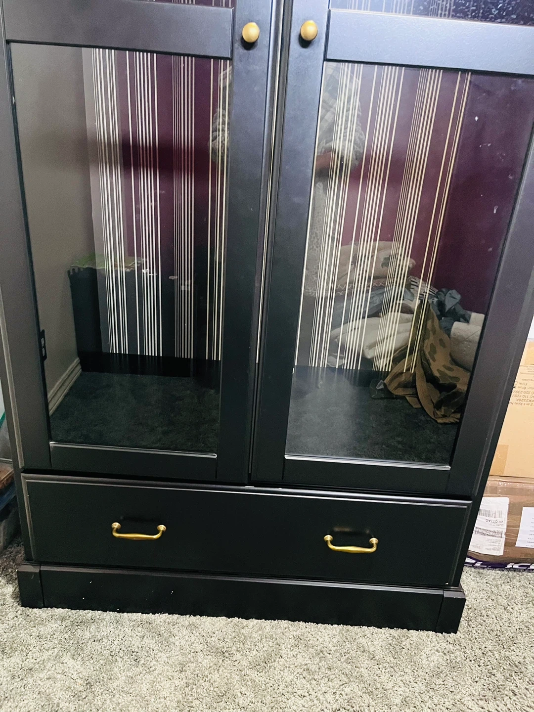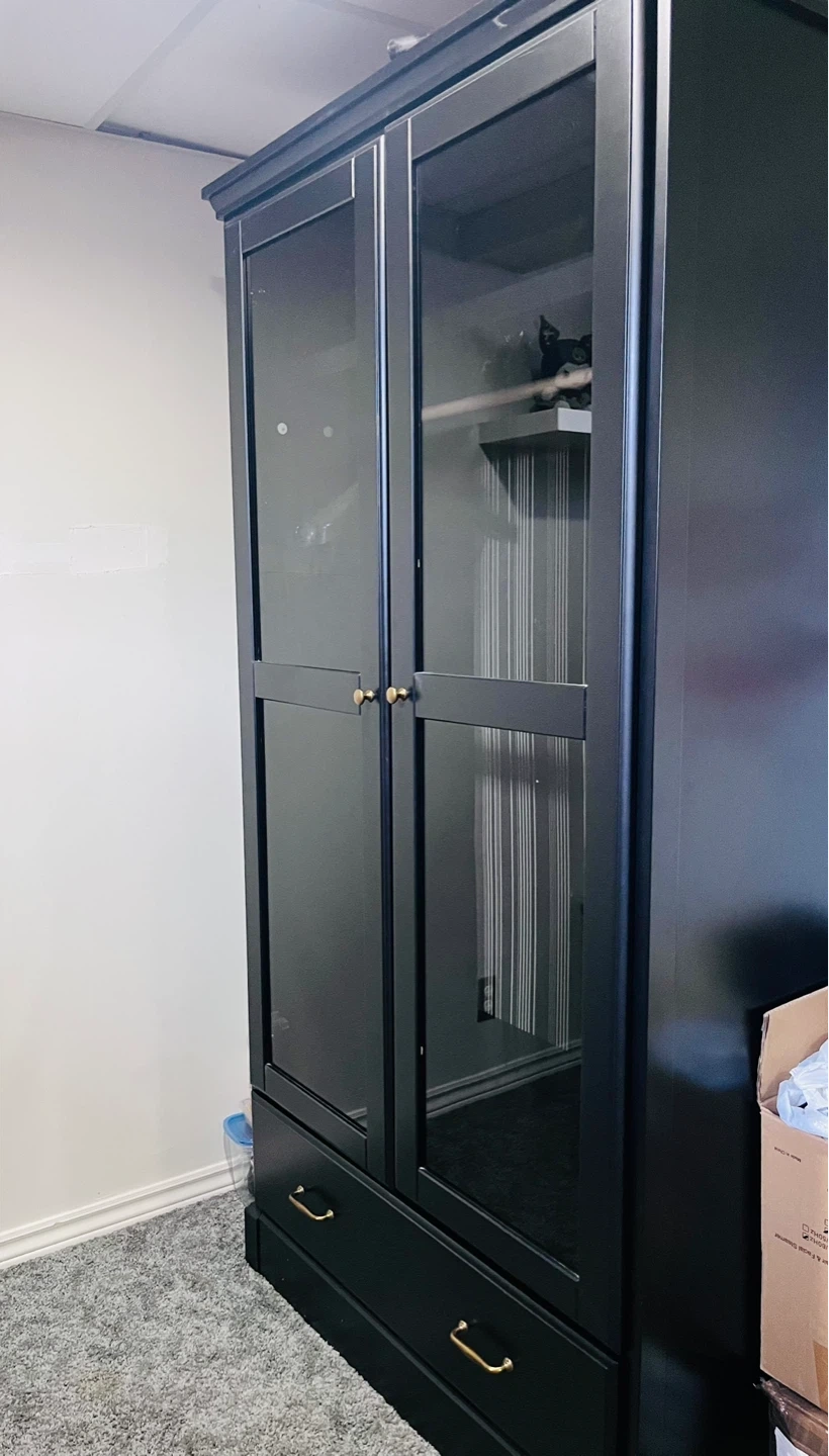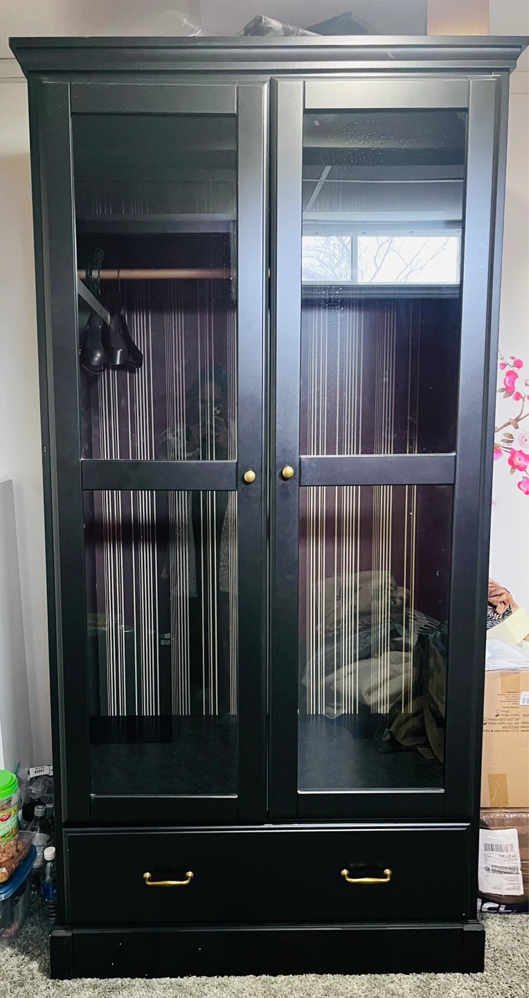 A black armoire featuring glass doors on top and two drawers at the bottom. It includes a hanging rod inside for clothes. It's a tall cabinet with gold-coloured hardware.
