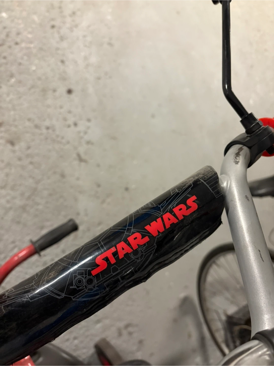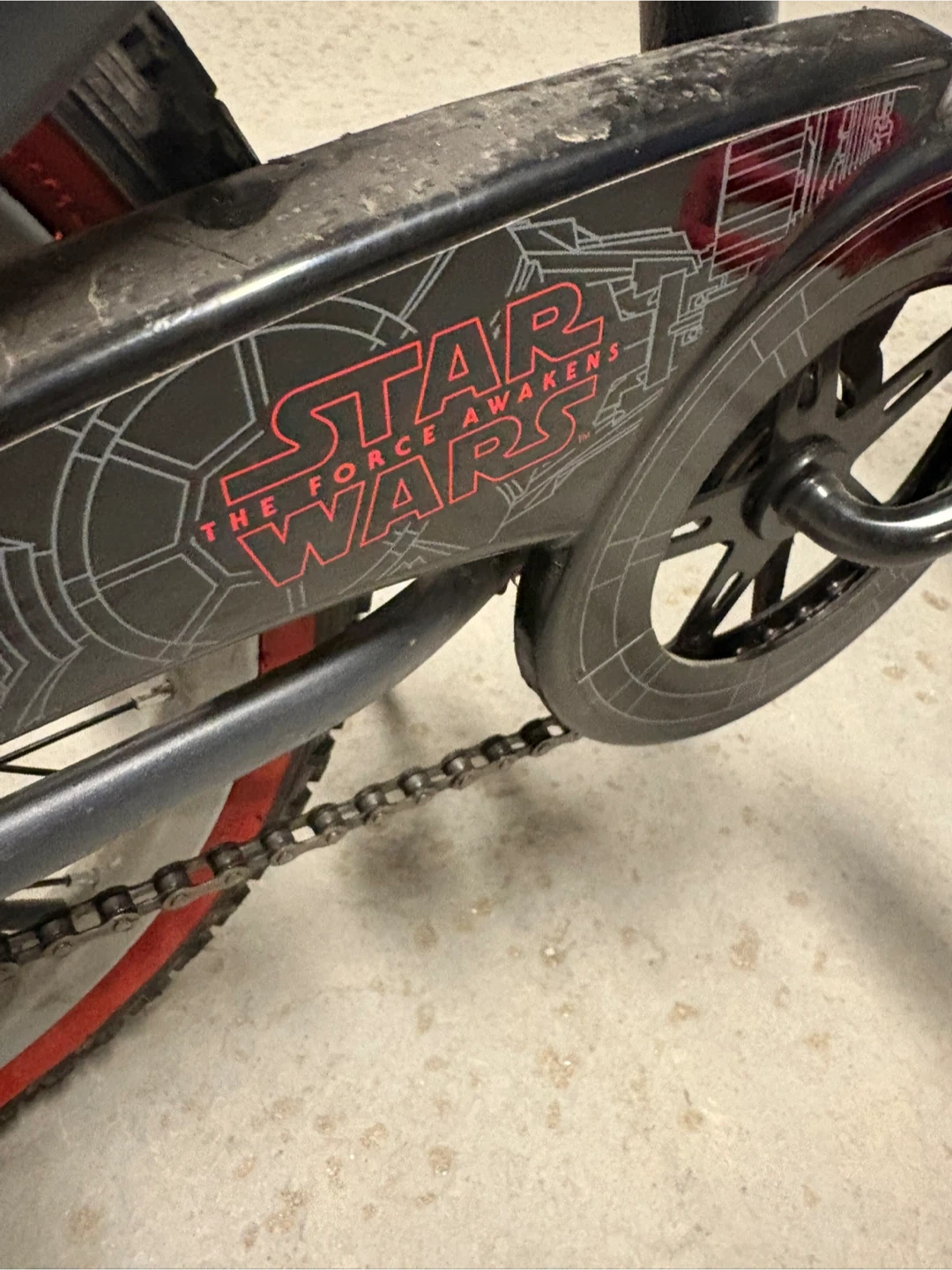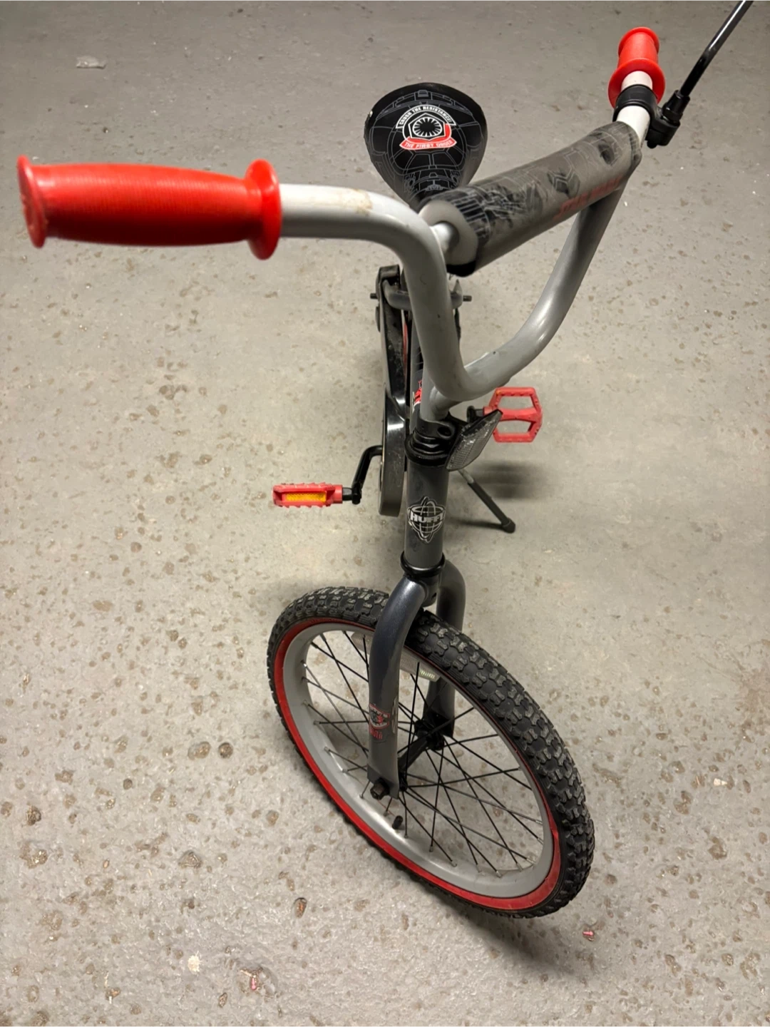 This grey Huffy BMX bike features a First Order Star Wars theme. It has red pedals and rims. The bike is suitable for kids.