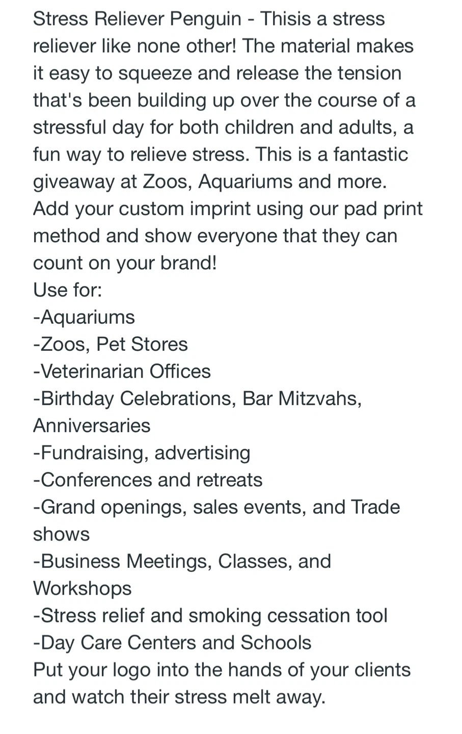 Brand new and leftover, they are similar to stress balls, but are definitely better b/c of their shape. Standing at 3” high, these cute little penguins of foam fits better in your hands. They are also great for exercising your hands/fingers/wrists.