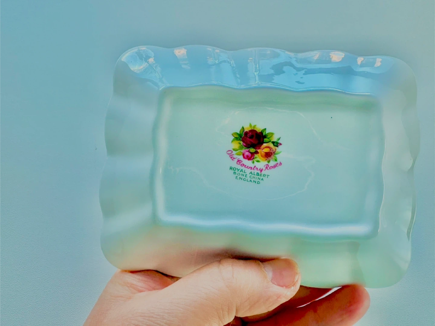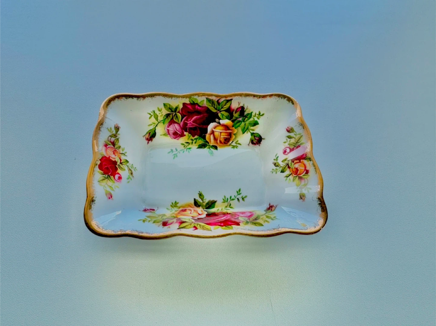A delicate Royal Albert dish featuring the beloved Old Country Roses pattern. It's made of fine bone china and has a scalloped gold trim. This piece is perfect for holding small trinkets or as a decorative accent.