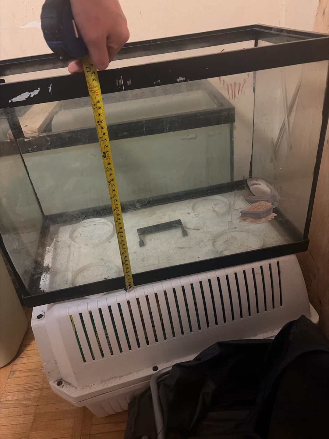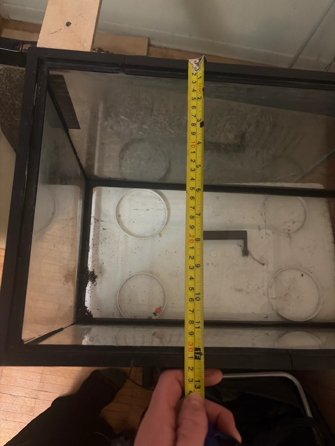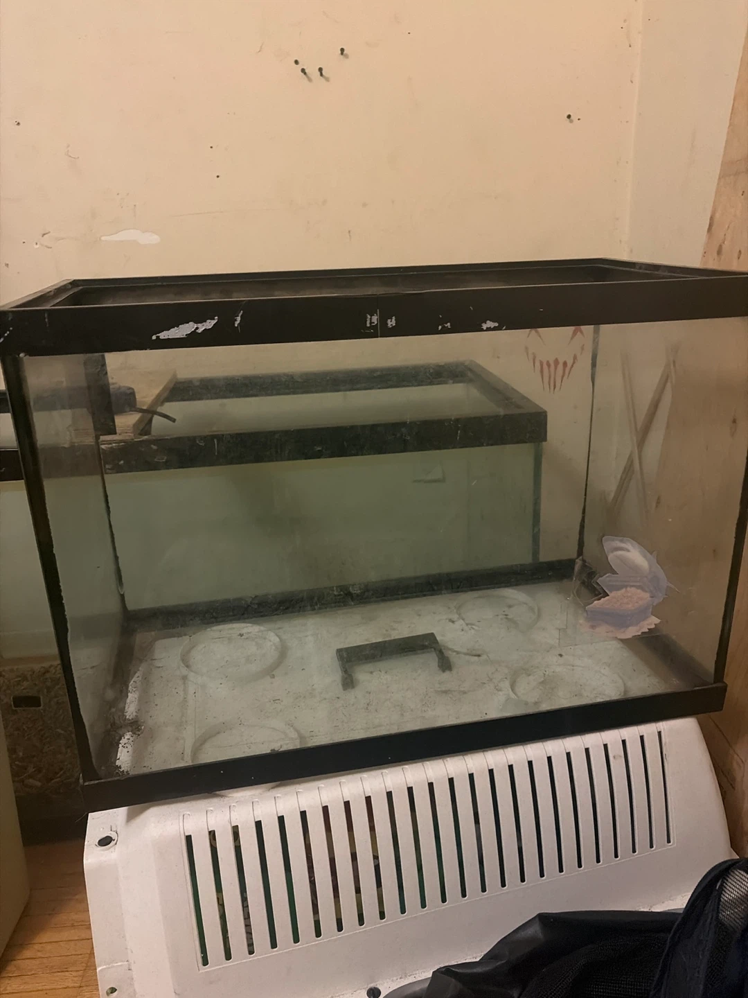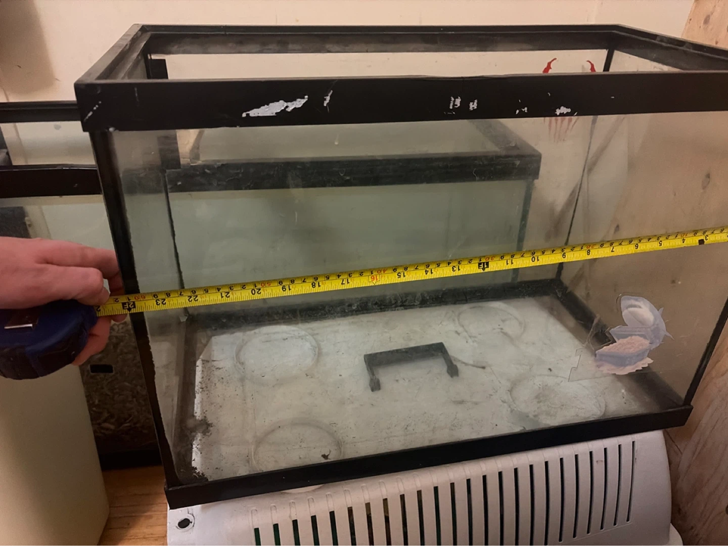 This is a glass aquarium tank. It's approximately 20 inches long, 10 inches wide, and 12 inches tall. It's suitable for small fish or reptile habitats. Tank is empty.