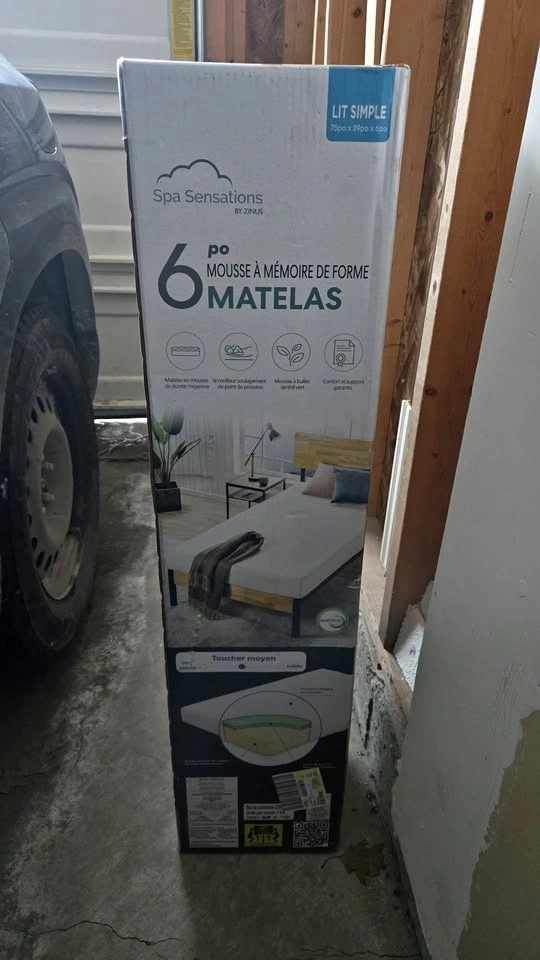 Selling a brand new Zinus Spa Sensations 6" Memory Foam Mattress, still in the original sealed box. Retails for $129.97+tax. Great for guest rooms, kids' rooms, sofa beds, RVs, campers, dorms, or rentals. Medium-plush memory foam for comfortable support. Easy setup as it's a mattress-in-a-box style. Perfect if you want a good quality mattress without paying full retail. New in box!