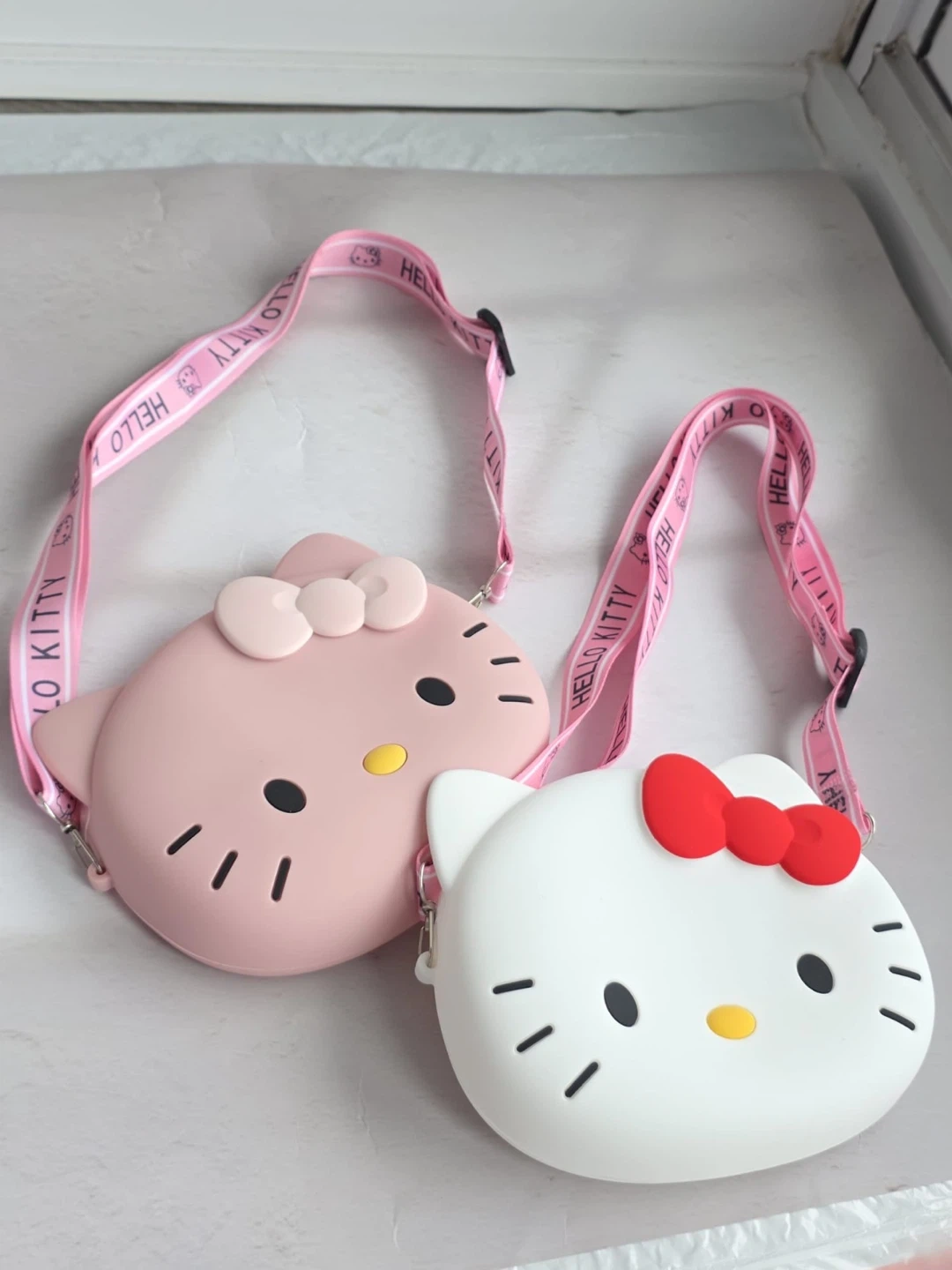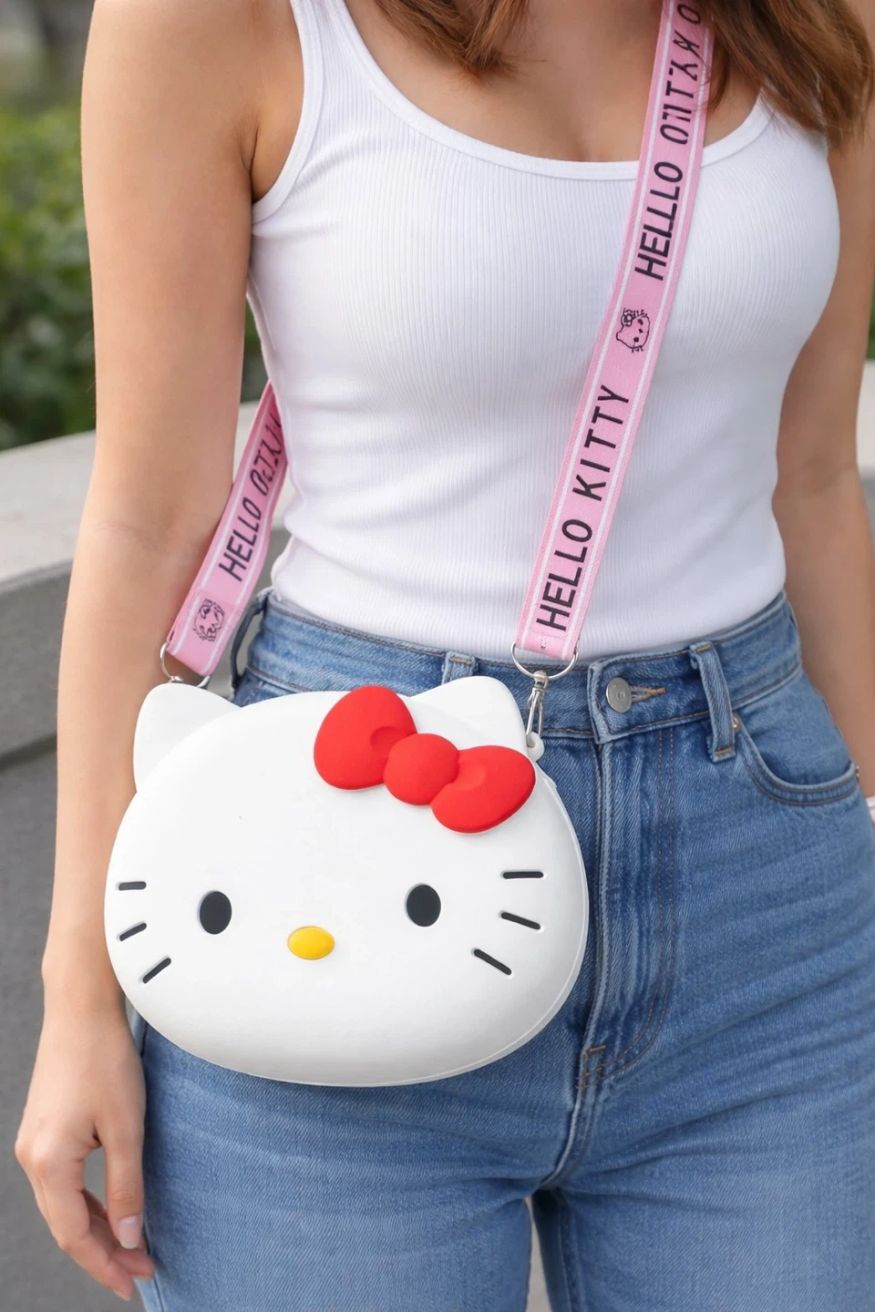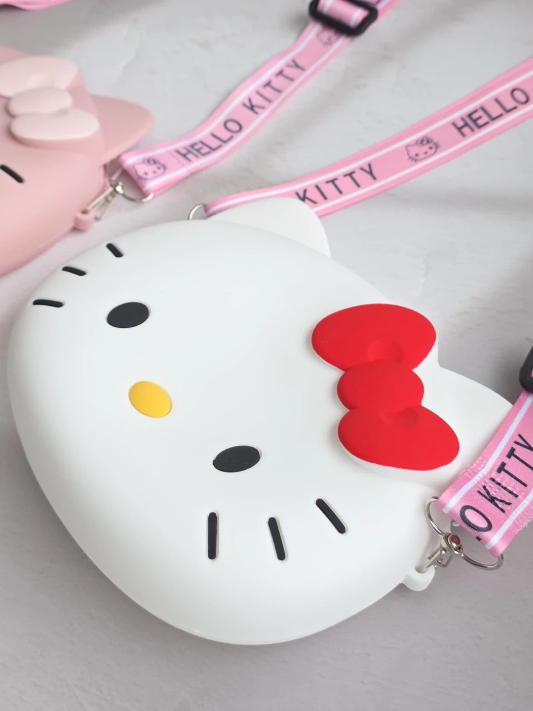 Cute pink Hello Kitty silicone crossbody bag! It's perfect for carrying small essentials. Made of durable silicone material.
