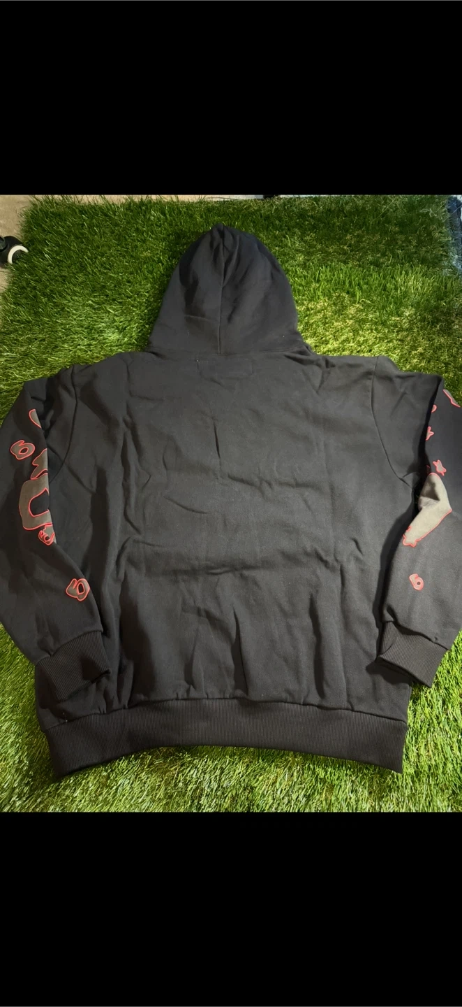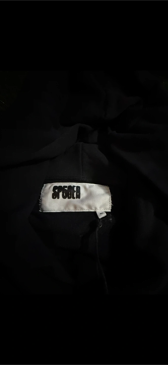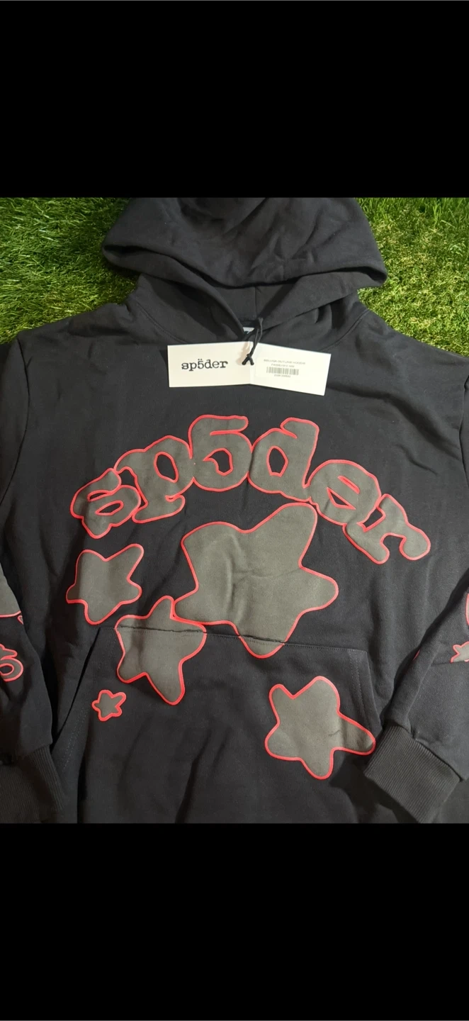 This is a black Sp5der hoodie with a Belluga Outline design. It features a graphic print on the front and sleeves. The hoodie is made of a comfortable fabric. It's a stylish piece for casual wear.