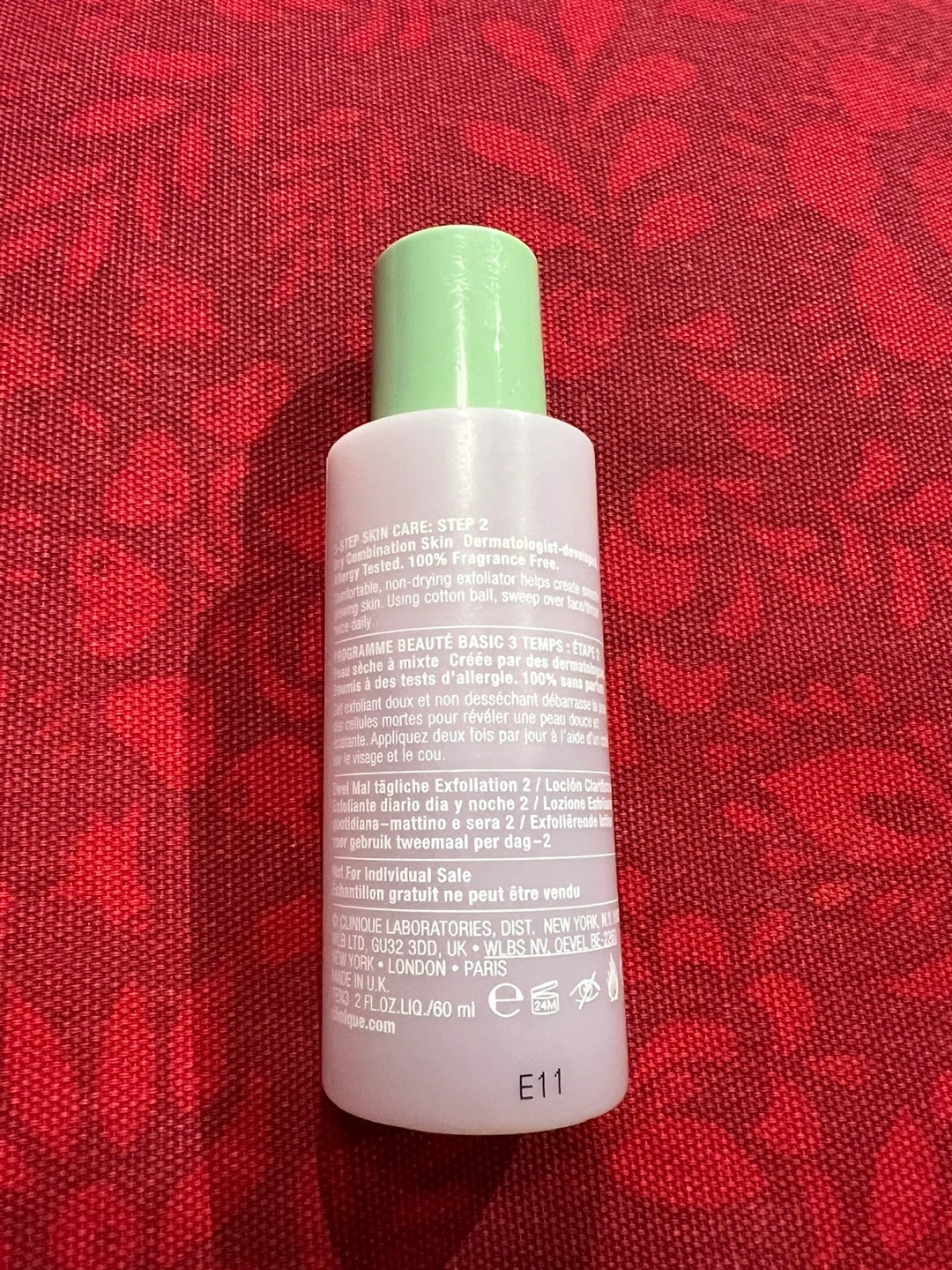 This is Clinique Clarifying Lotion 2, a twice-a-day exfoliator. It's formulated for dry combination skin. The bottle contains 60 ml of product.