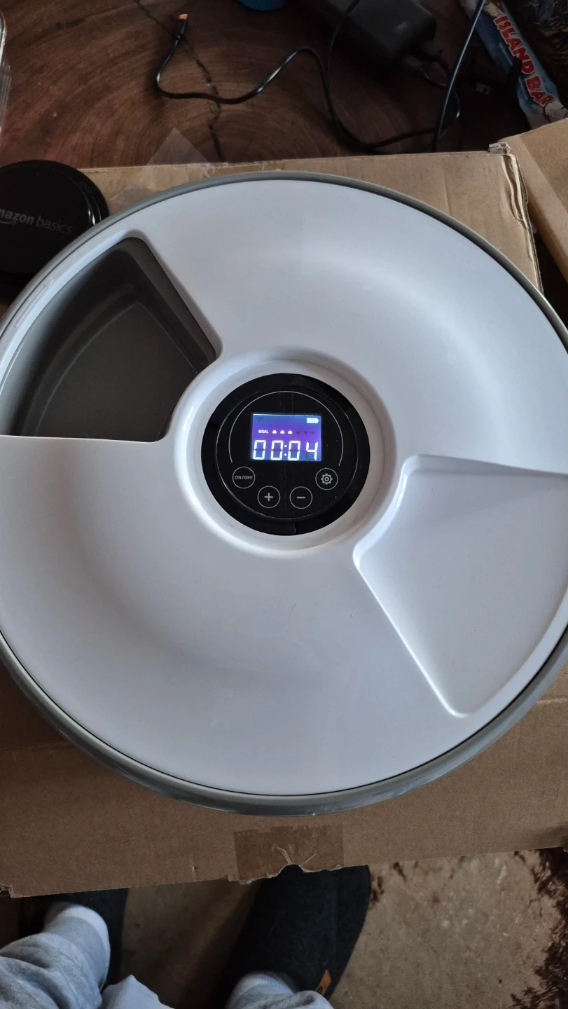 This is an Amazon Basics automatic pet feeder. It's white and features a cooling pack to keep food fresh. The digital display allows for easy programming of meal times.
