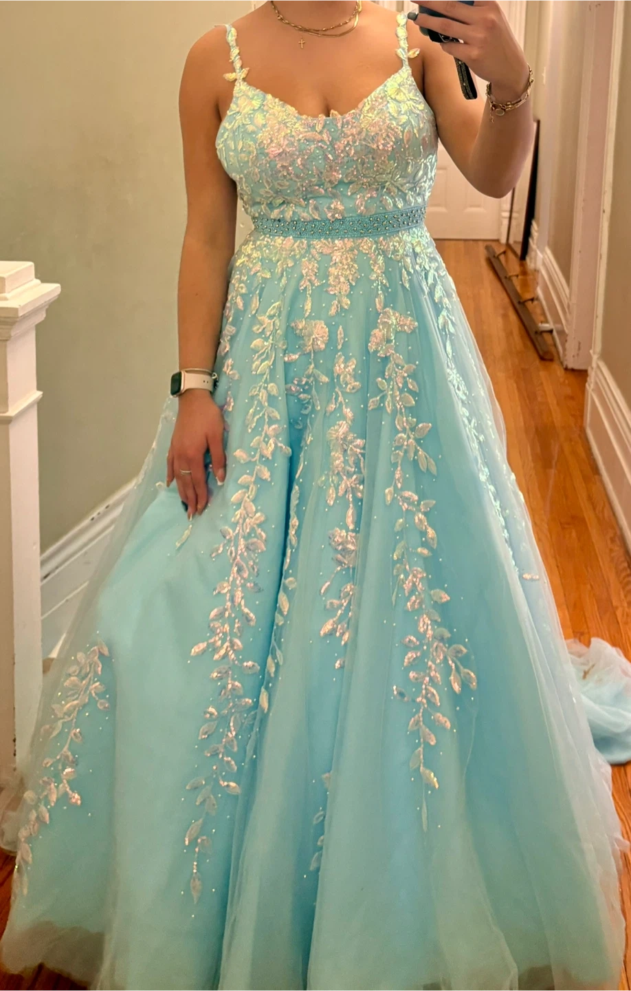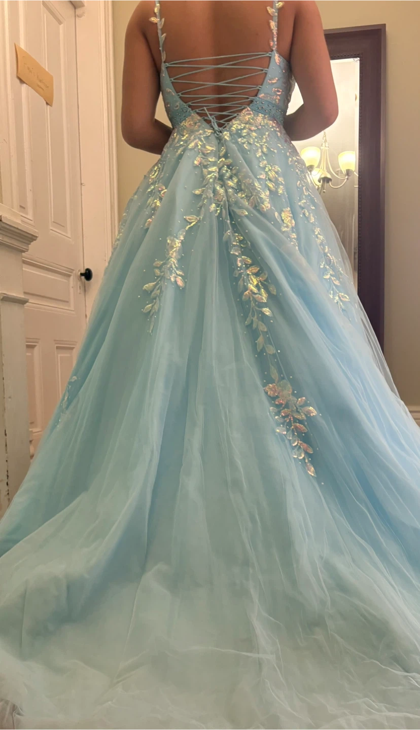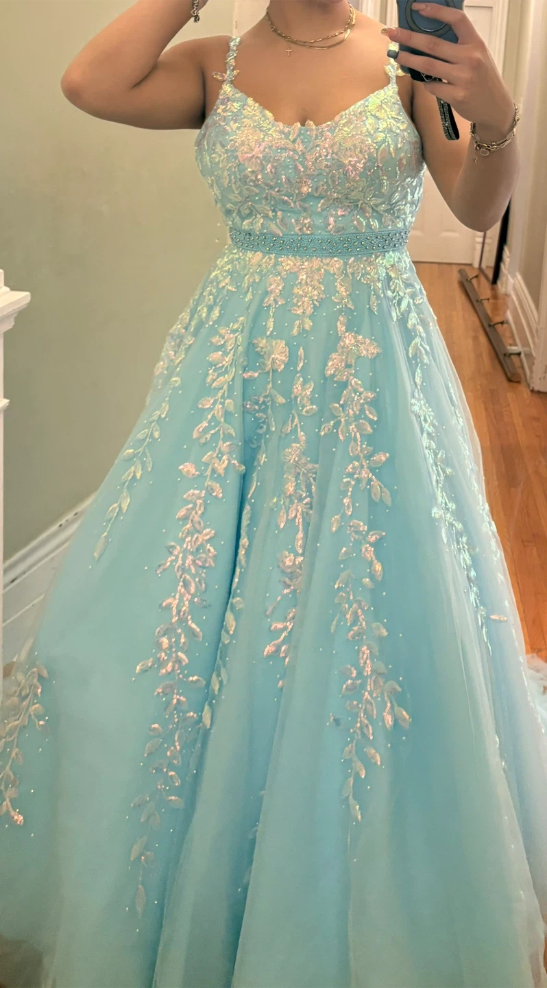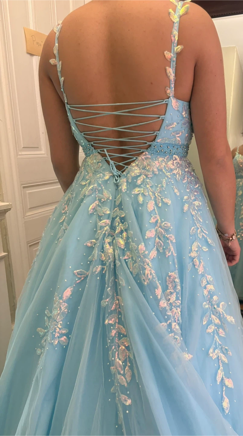 Stunning light blue ball gown featuring intricate floral beadwork and sequin details throughout. It has a sweetheart neckline, spaghetti straps, and a lace-up back. Perfect for prom or a formal event!