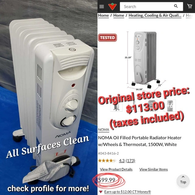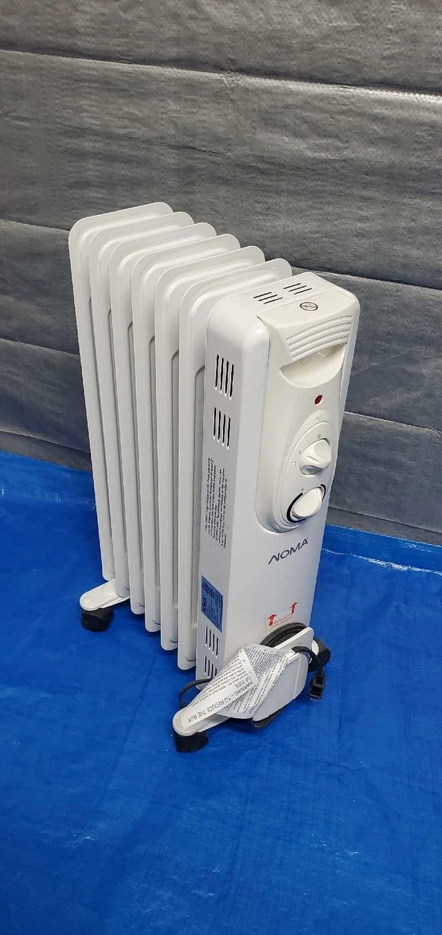 ➡️ Keep your space cozy with this Noma oil-filled portable radiator heater, featuring wheels, a thermostat, and 1500W of power. This unit has been thoroughly cleaned and is ready to provide warmth wherever you need it. This heater is used, but it's in good working condition.