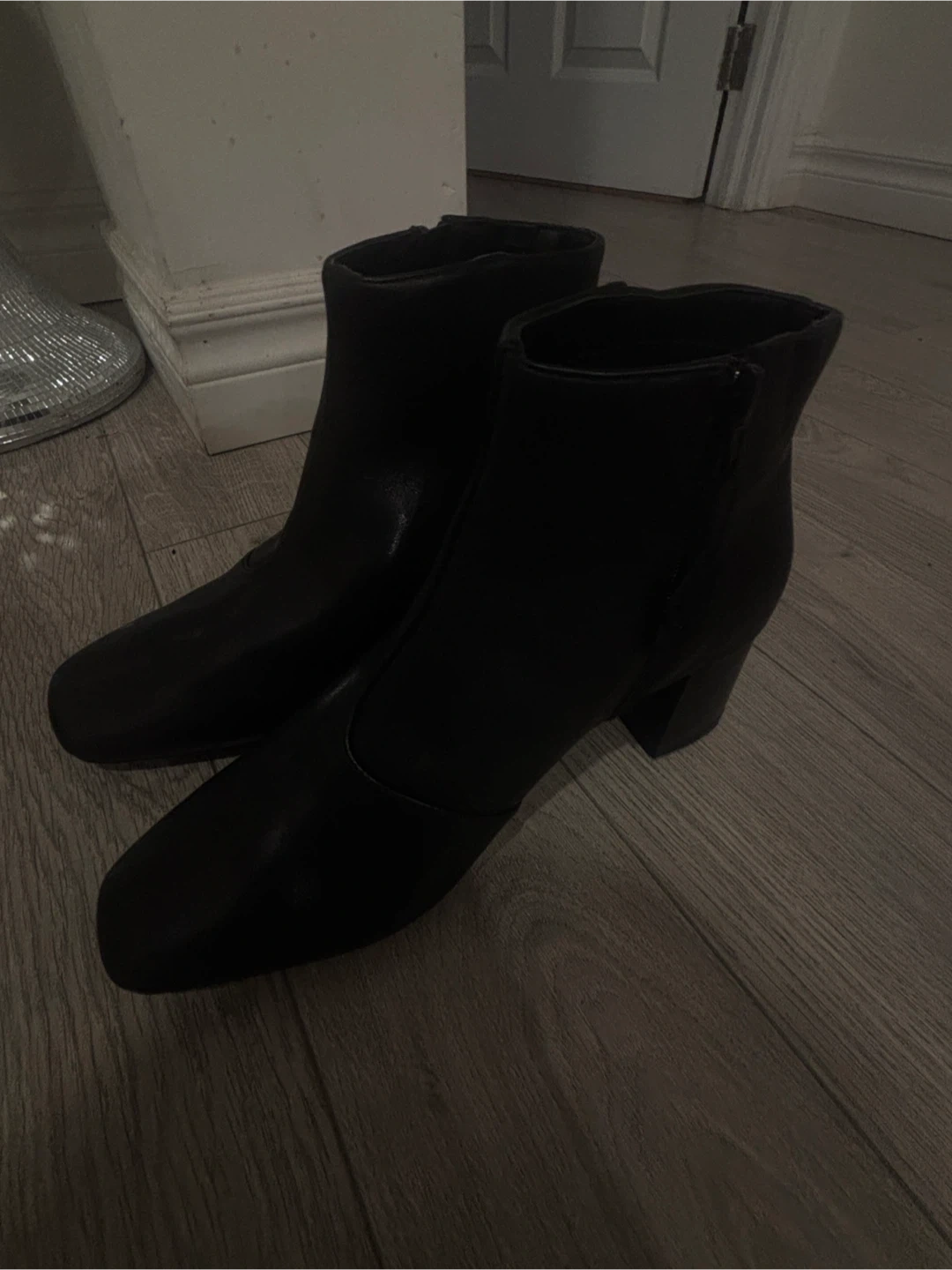 Classic black leather ankle boots. Features a stylish square toe and a comfortable block heel. Includes the original box and tissue paper.