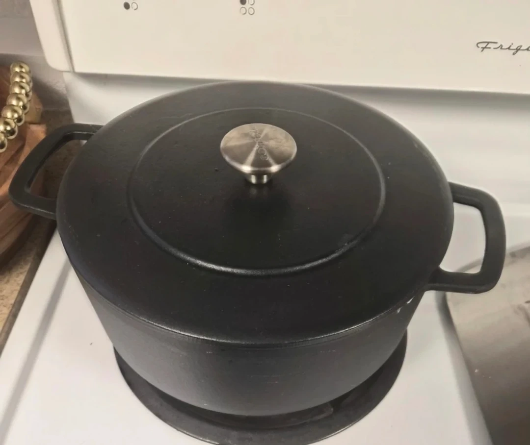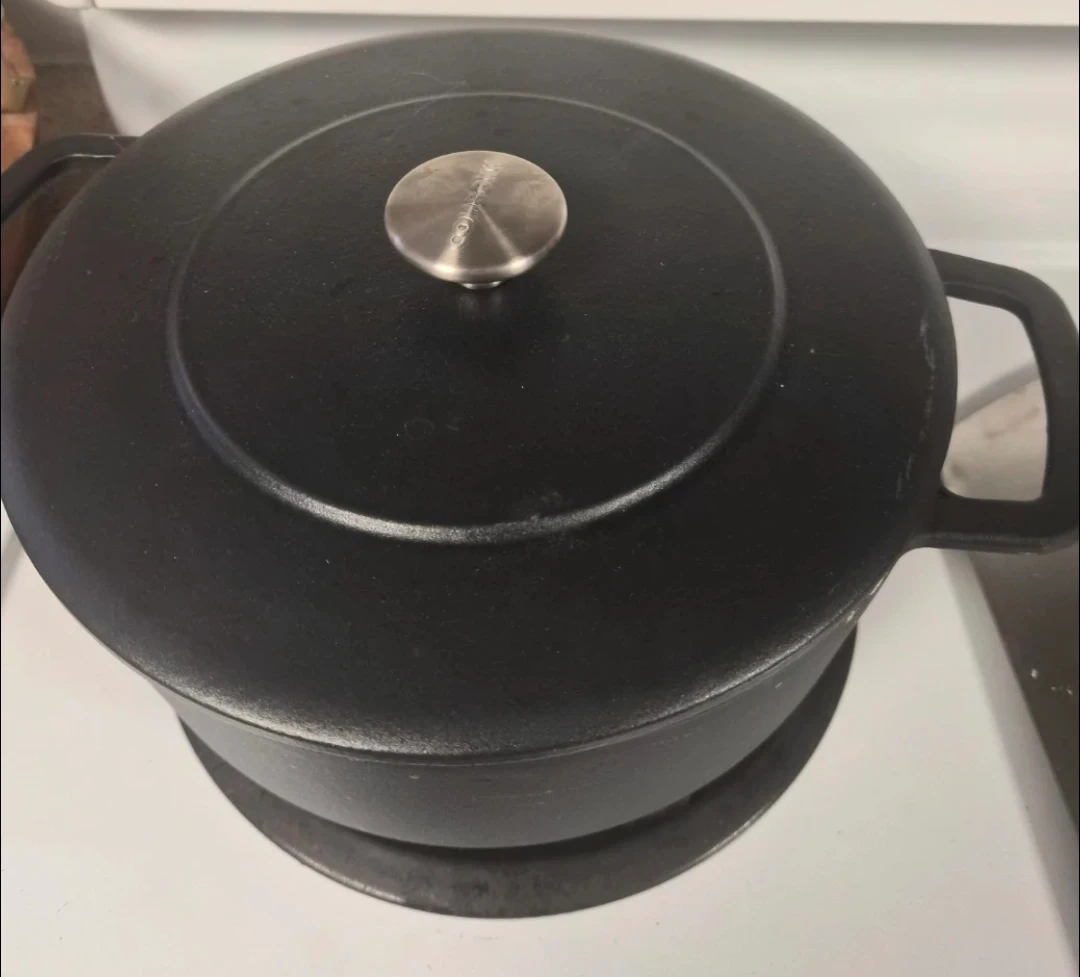 This is a black Lodge enamel Dutch oven. It's made of cast iron with a smooth enamel coating. It's great for braising, baking, and stews. Perfect for any kitchen!