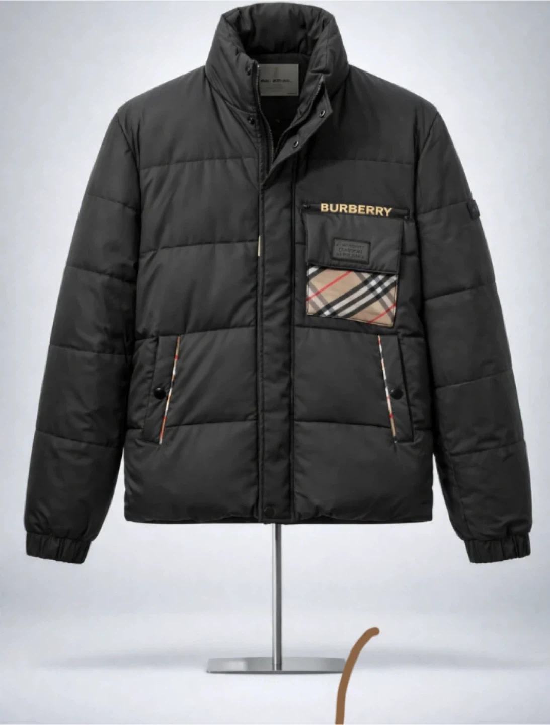 Burberry black puffer jacket with signature nova check details. It's a stylish and warm outerwear piece. Perfect for cooler weather!