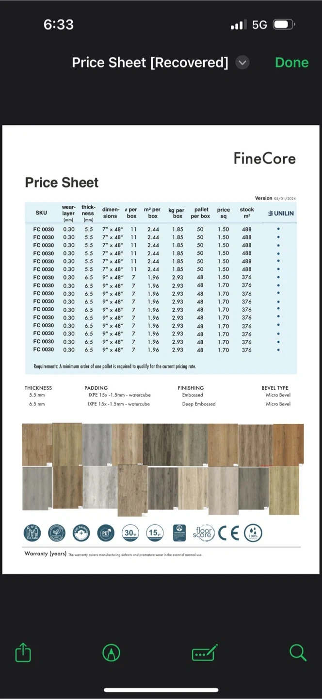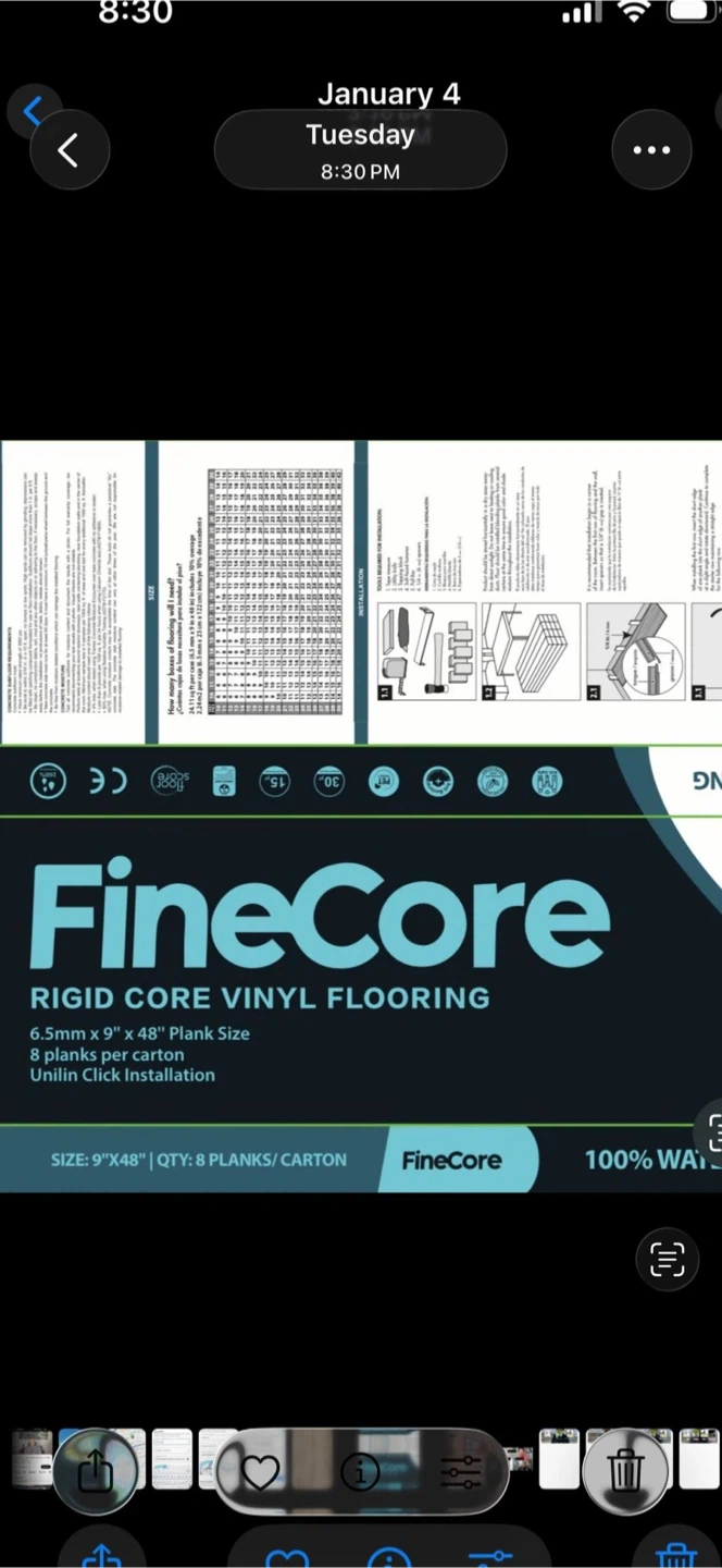 FineCore Rigid Core Vinyl Flooring. Each plank is 9" x 48". This flooring is 100% waterproof and features Unilin Click Installation. It's sold with 8 planks per carton.