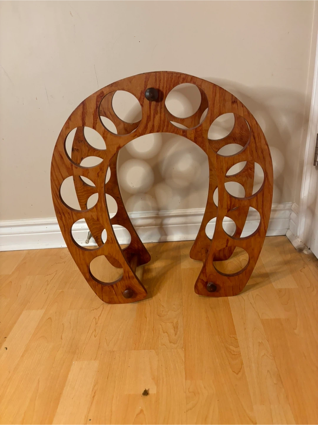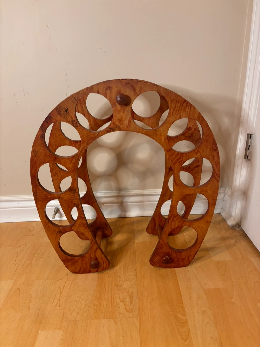 Unique horseshoe-shaped wine rack crafted from solid wood with a rich natural grain. Designed to hold multiple wine bottles while also serving as a decorative statement piece. Sturdy, well-made, and perfect for a bar area, dining room, cottage, or wine lover’s space.