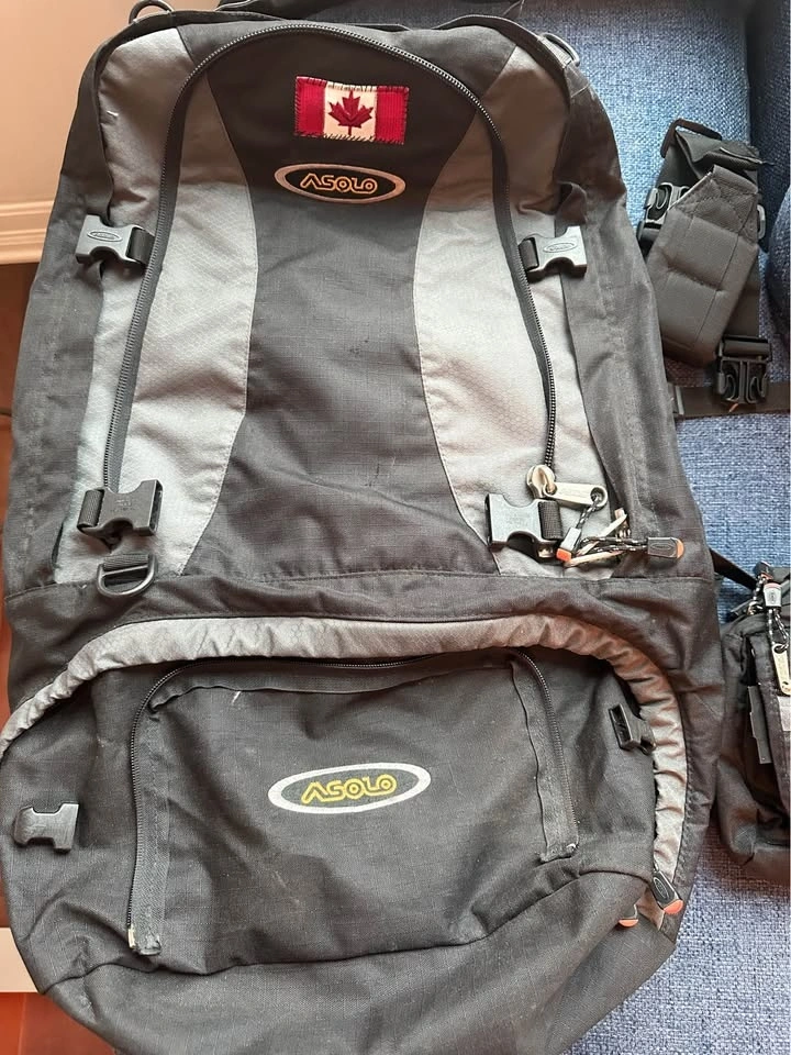 Zip off day pack and fanny pack / shaving kit. Zip off divider. Storage pockets and packing aids in main compartment. Internal frame. Rain & travel cover. Shoulder strap. Padded handle. Duffle bag strap. Full hide-away suspension system. Deluxe padded hip belt with handy storage pocket. Duo hip belt for easy adjustment. Asolo sliding torso-adjusting suspension. Full front panel access to main compartment. Main compartment with zipper divider. Interior organizer system in main compartment. Emergency whistle on sternum strap.