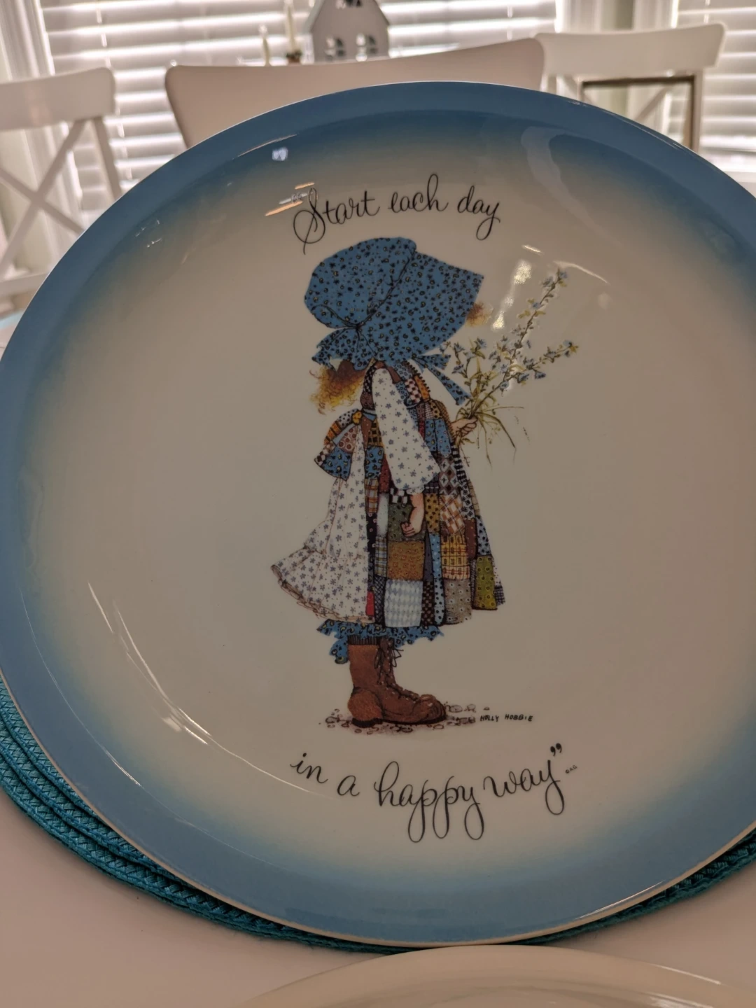 Decorative plate featuring Holly Hobbie's artwork. It reads 'Start each day in a happy way'. Ceramic material with a blue rim.