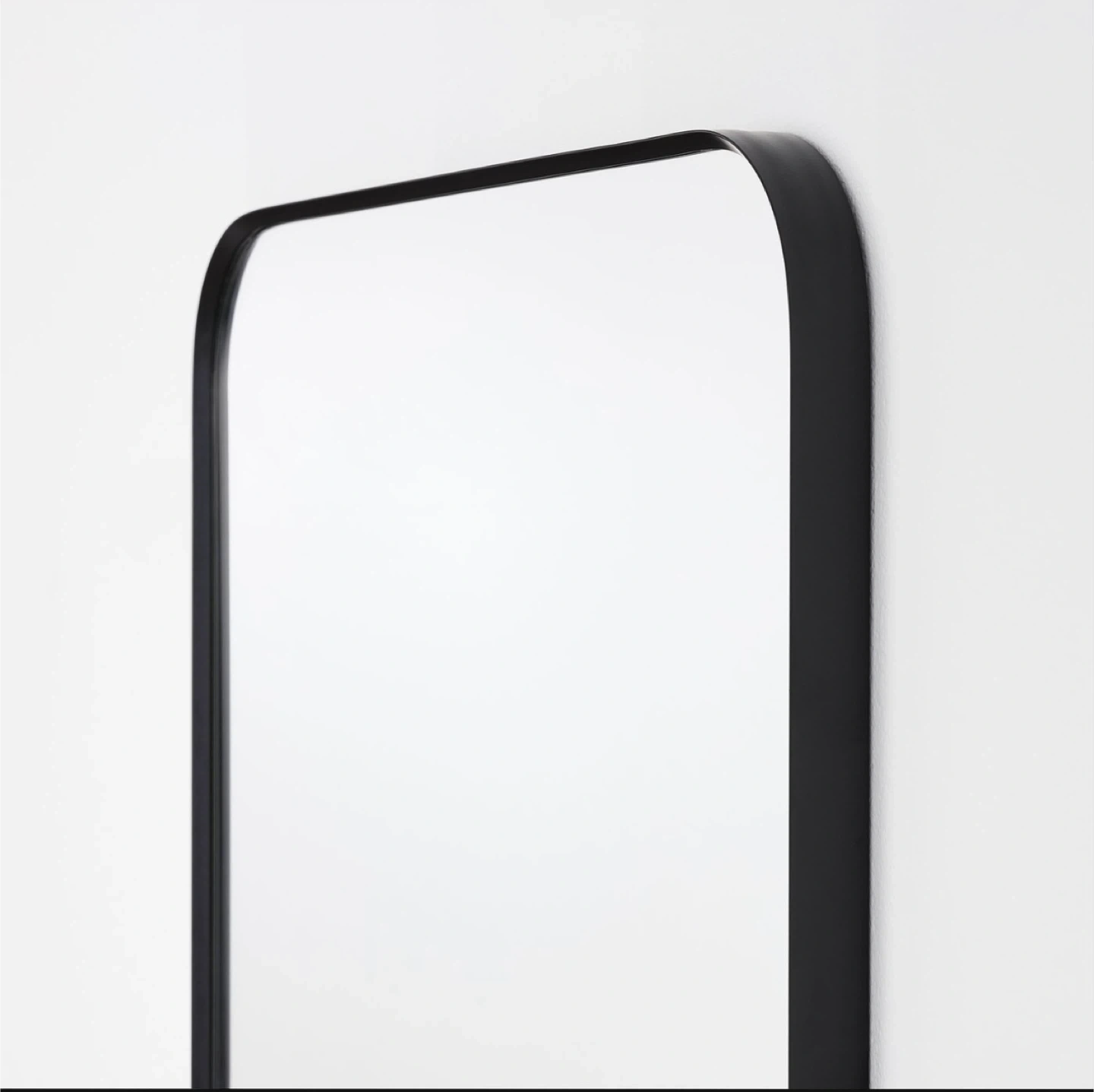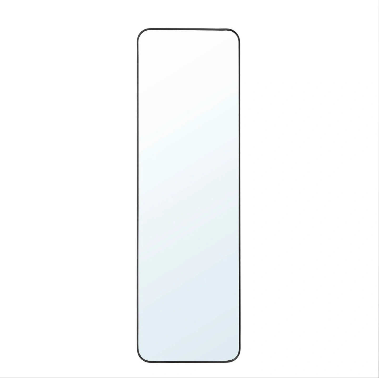 This is an IKEA LINDbyn mirror in black. It's a full-length mirror with a sleek, rounded frame. Dimensions are 15 3/4 inches wide by 51 1/8 inches tall.