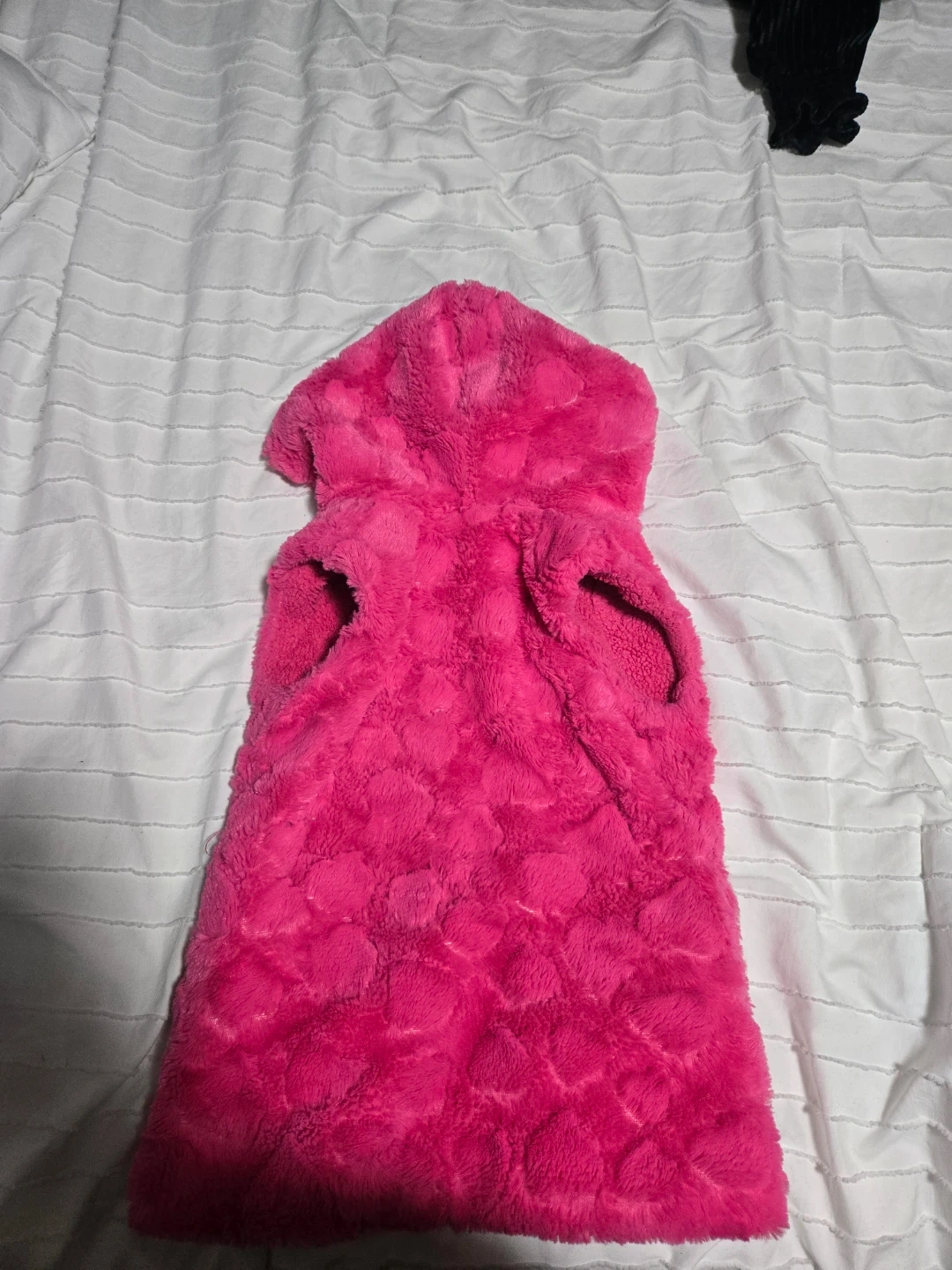 A cozy pink hooded fleece vest from Sincere. It's got a soft, fuzzy texture with a full zip front and toggle closures. This vest is perfect for keeping little ones warm on cooler days!