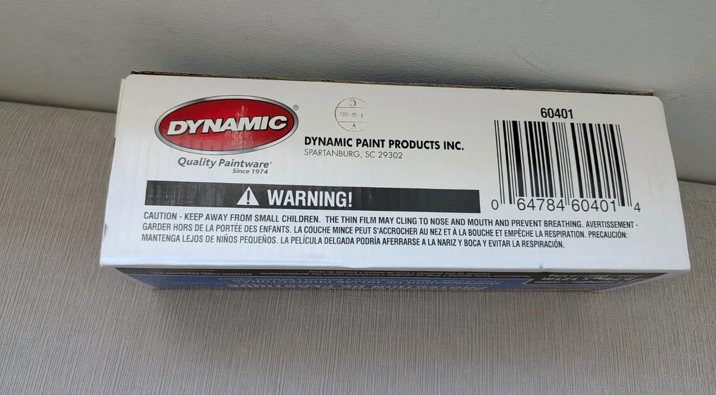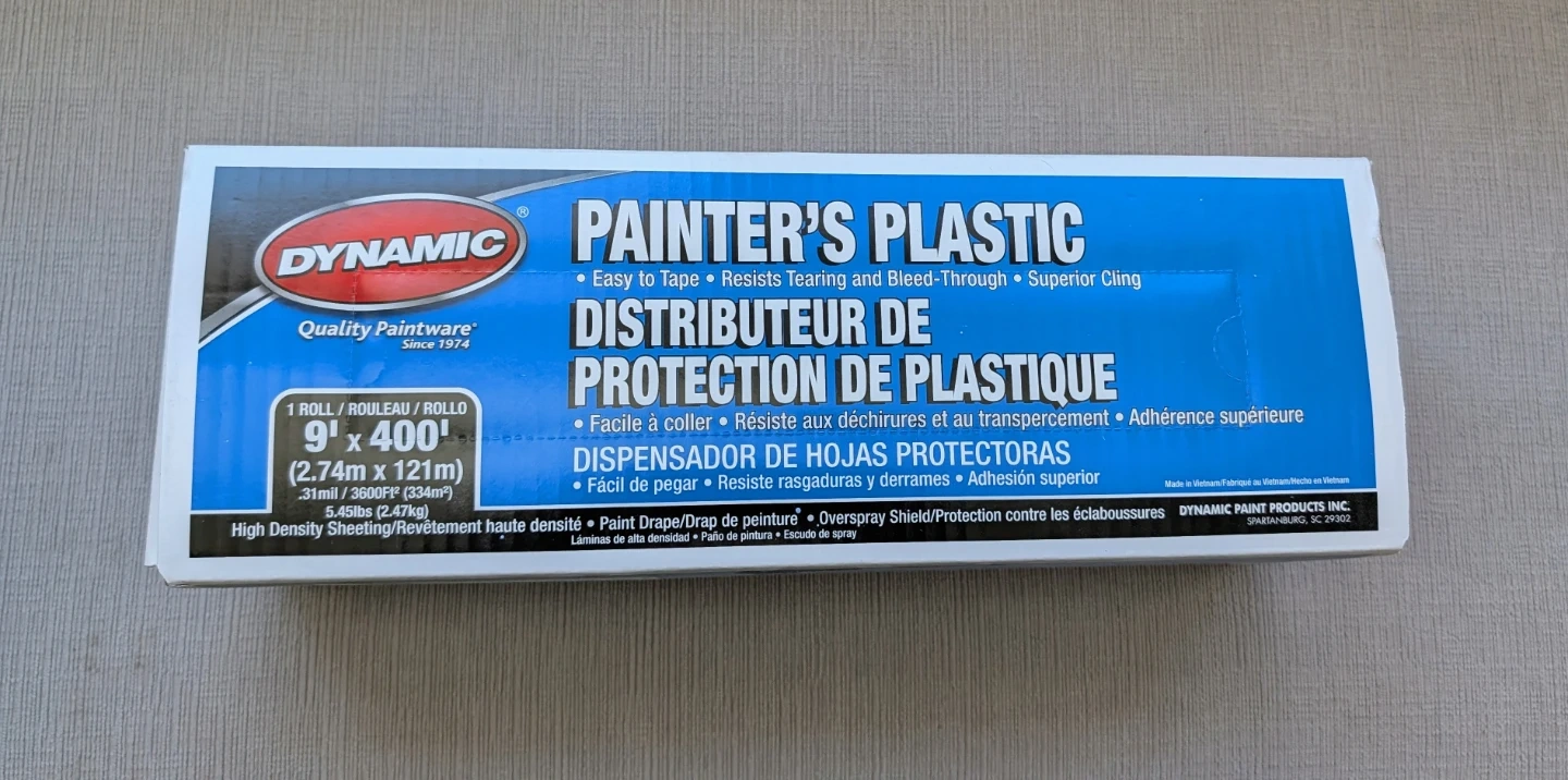This Dynamic Painter's Plastic is 9 feet by 400 feet. It's designed to be easy to tape and offers superior cling. This high-density sheeting resists tearing and bleed-through.