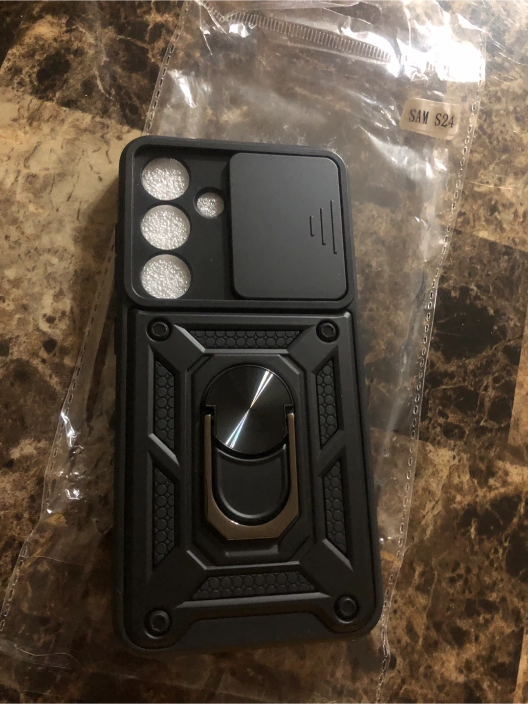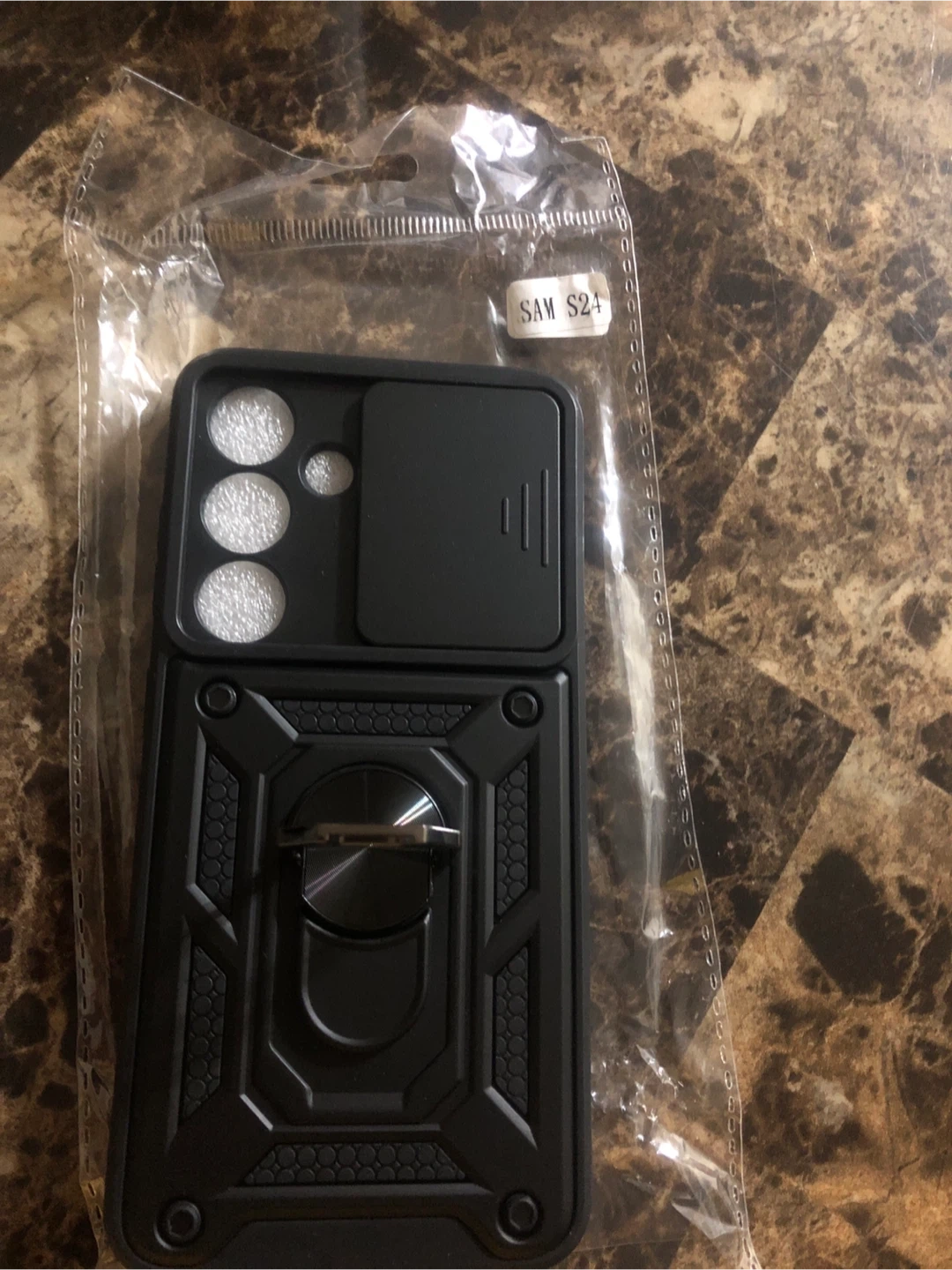 Selling a brand new black phone case for a Samsung S24. It's still in its original packaging and has a cool design with a ring stand and camera cover! Never used and ready for a new phone.
