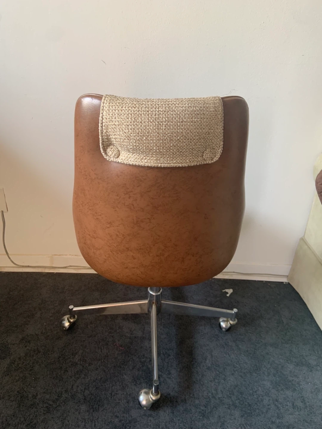 Offers two-tone brown and beige upholstery with a tufted backrest. Features a chrome five-star base with casters.