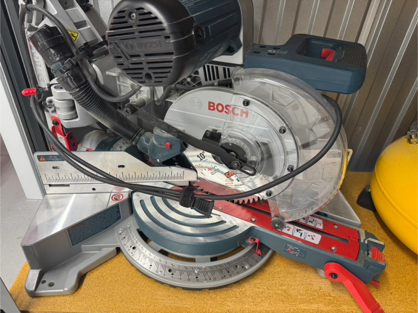 Bosch 10-inch miter saw. It's a powerful tool for making precise cuts. Includes blade guard and power cord.