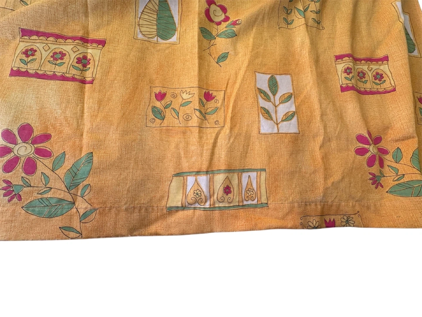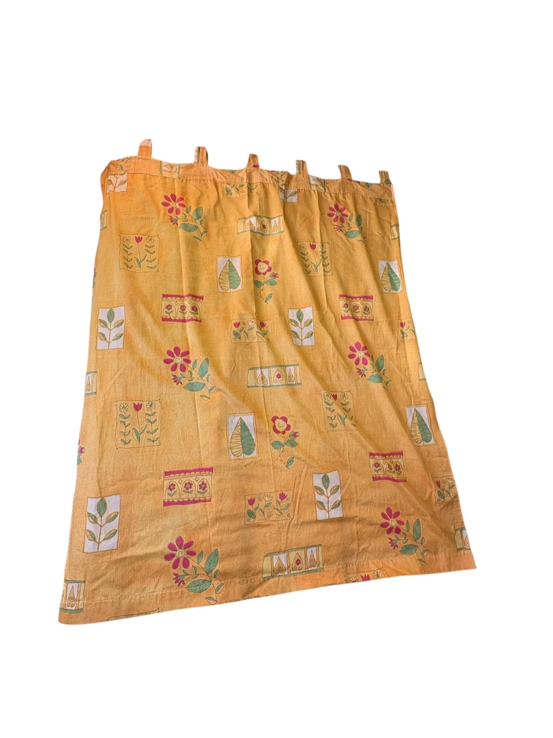 Yellow fabric panel with a floral pattern. It's a single curtain with tabs at the top for hanging. Fabric material. 66” long by 51” wide. There’s some wear at the bottom as shown.