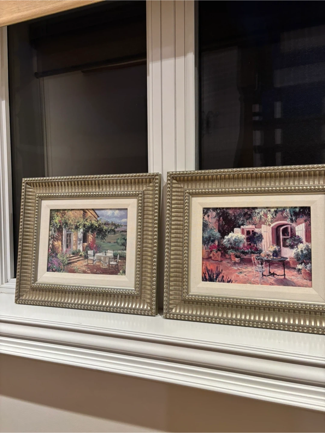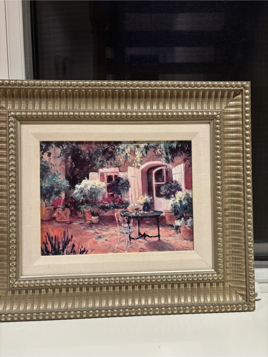 This framed print depicts a charming French countryside courtyard scene. It features a table and chairs set up outdoors, surrounded by lush plants and flowers. The detailed artwork is housed in a decorative gold-toned frame. It's ready to hang and add a touch of European charm to your home!
