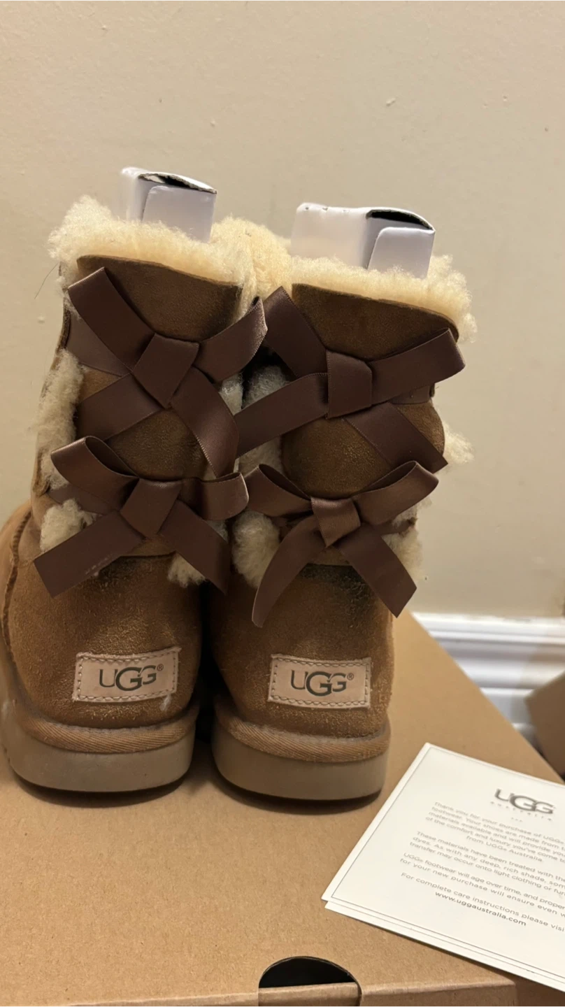 194Selling a pair of UGG boots in brown with a cute bow detail on the back! Comes with the original box.