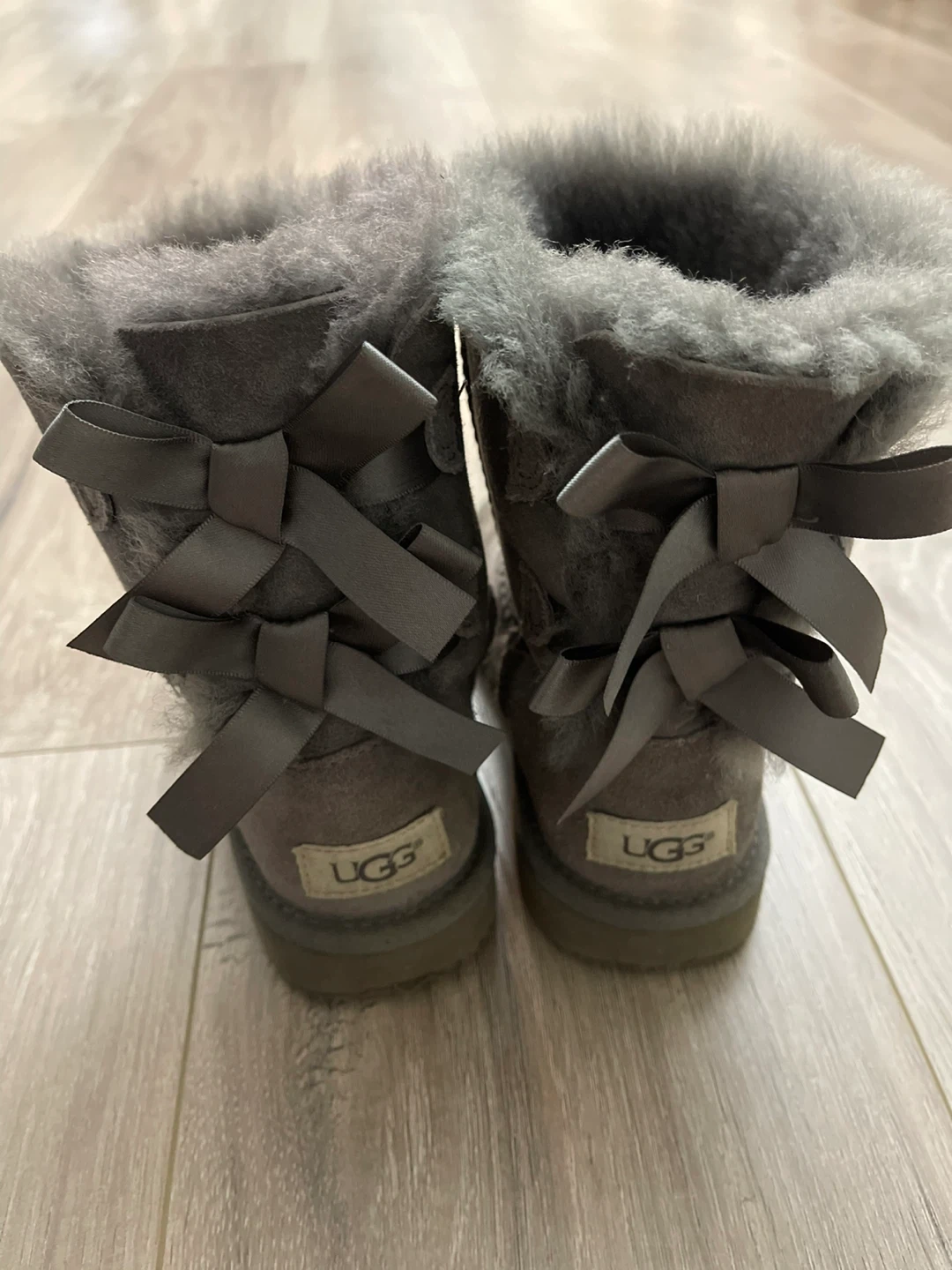 10Selling a pair of authentic UGG Australia boots for kids in gray, featuring cute bows on the back! They are a size 2Y in Excellent condition. The soles show some wear, but they're still comfy and have long life left in them as my daughter barely wore them .