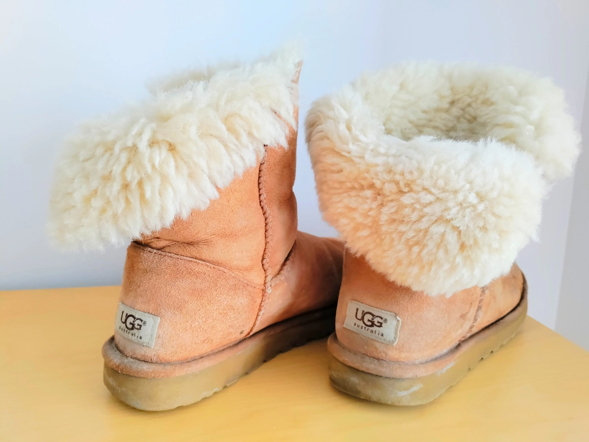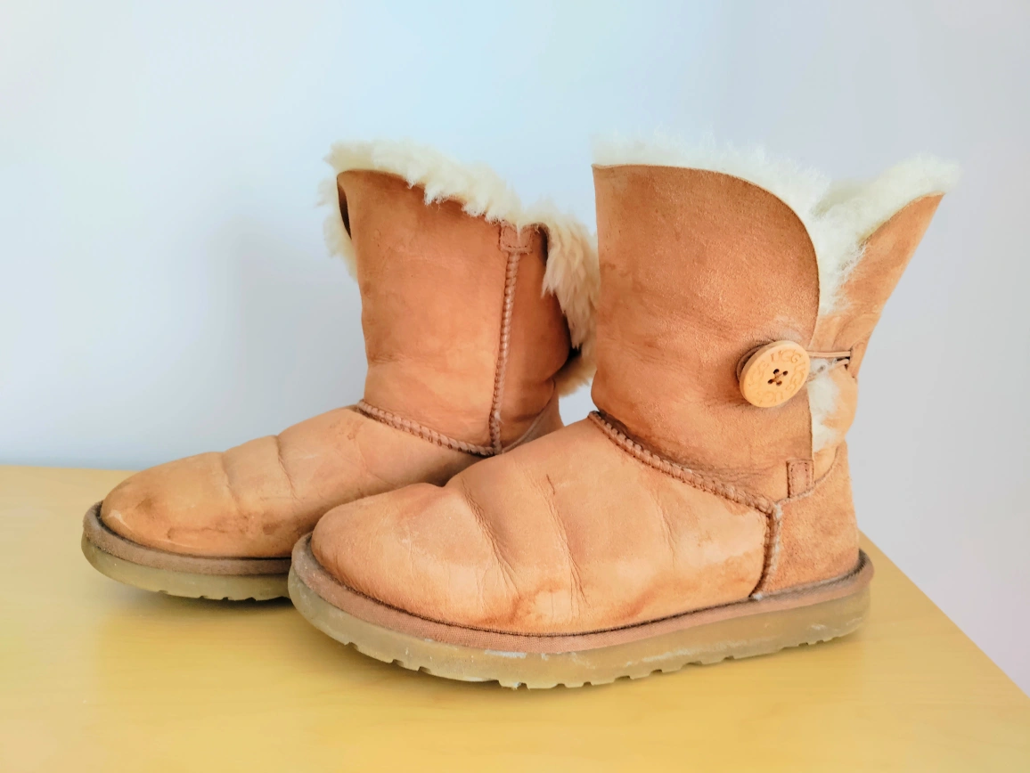 1000+Women's UGG Australia Classic Mini Bailey Button boots. Light brown suede leather. Fold-over cuff. Button closure. Worn but good condition.